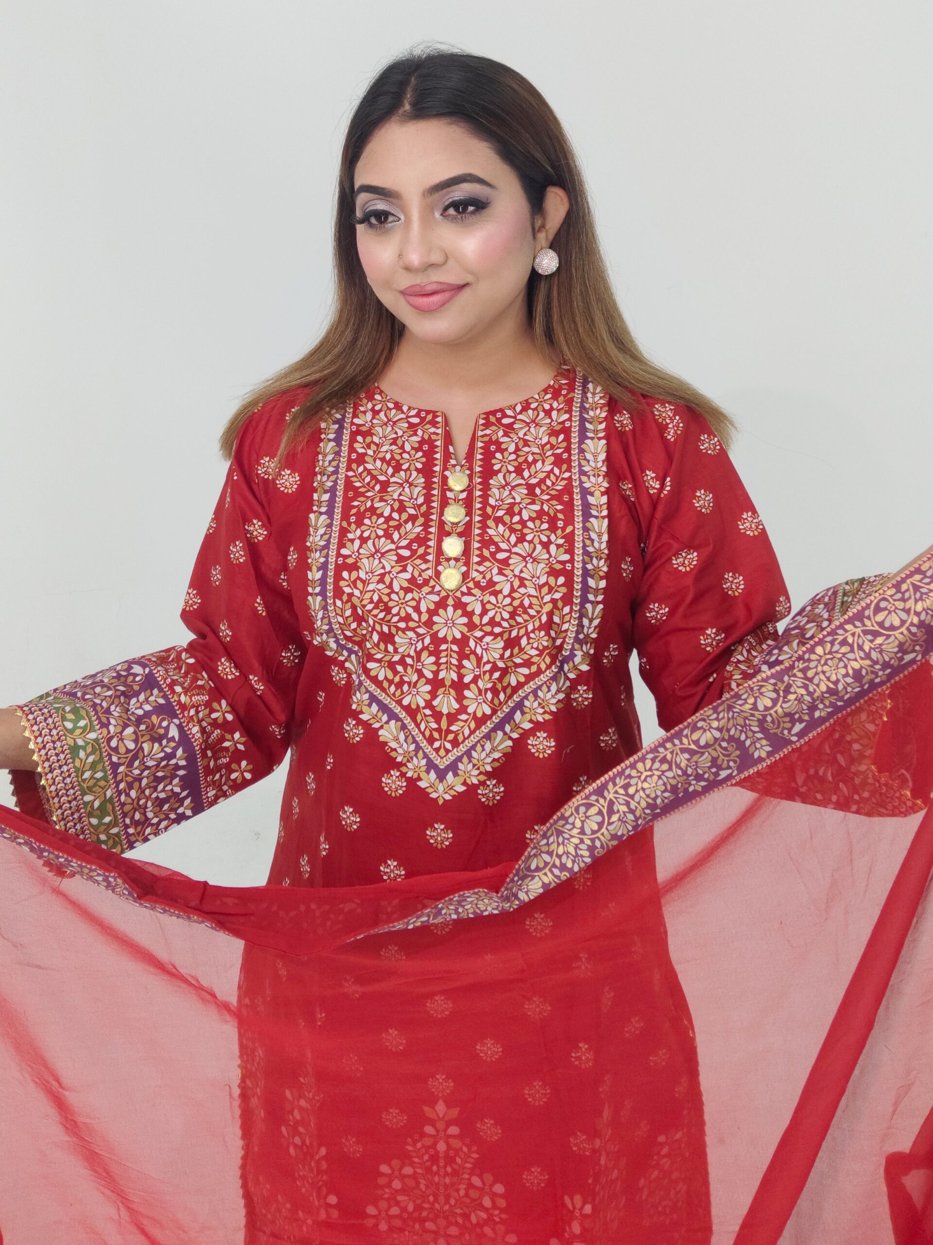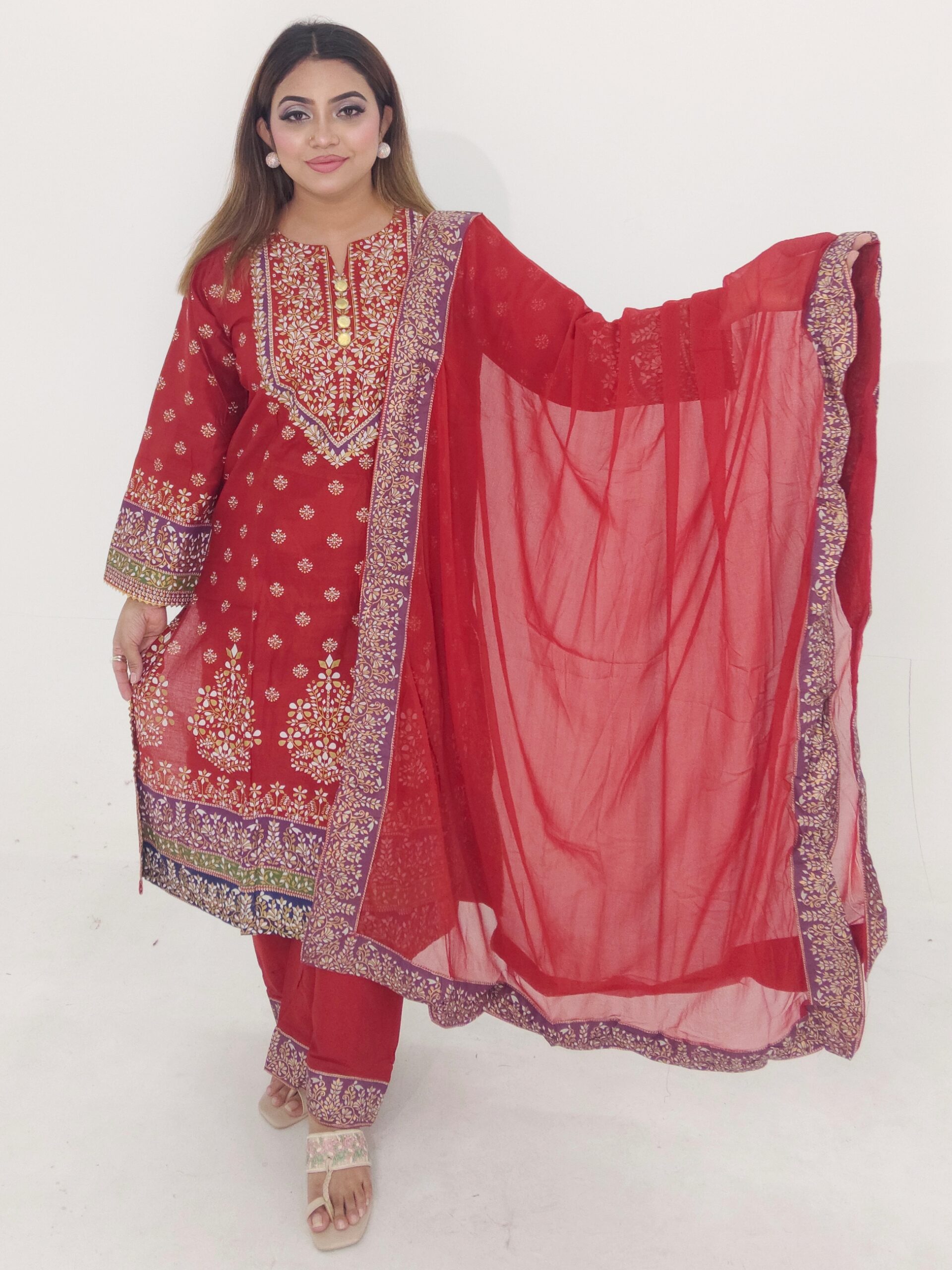Comfortable Cotton Embroidered Kameez, Dupatta & Pant Set