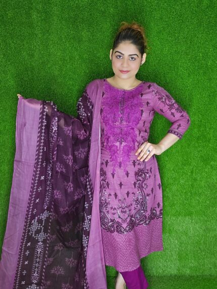 Cotton Embroidery & Sequence Work Unstitched 3-Piece Dress