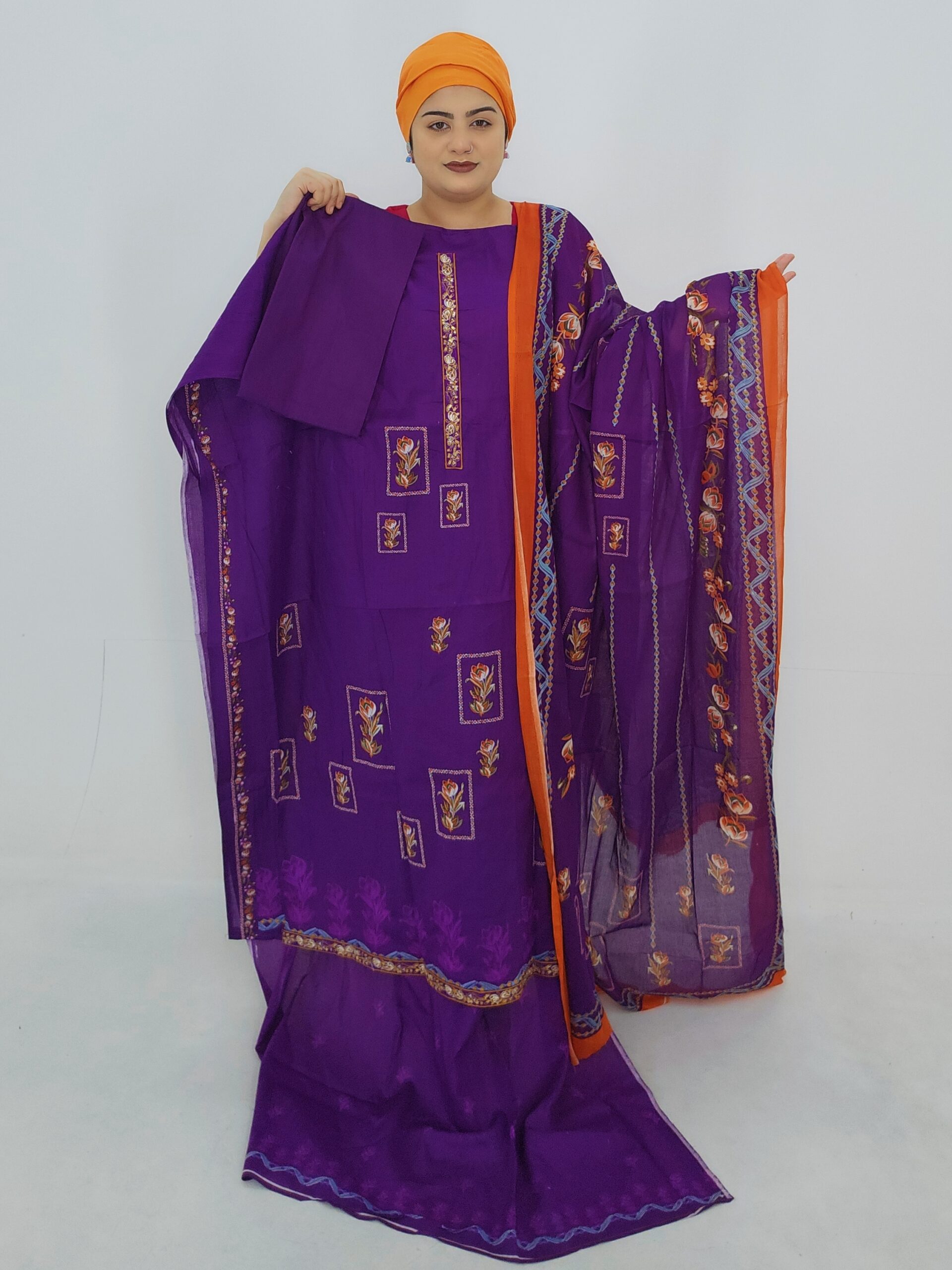 Elevate your everyday style with our beautifully crafted F324 Unstitched Cotton Three-Piece Dress Set, designed to blend comfort with timeless elegance. Made from soft, breathable cotton fabric, this outfit features delicate embroidery with sequence work that adds a subtle festive shine—perfect for both casual wear and special moments. Its unstitched design gives you full freedom to customize the fit just the way you like, ensuring both comfort and confidence all day long. Available in three rich and eye-catching shades—Majenda, Royal Blue, and Purple—this set brings versatility and sophistication to your wardrobe.