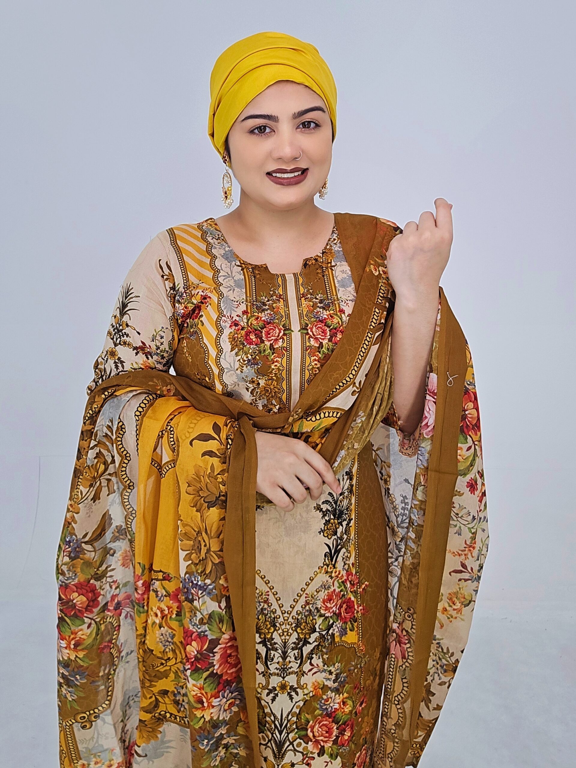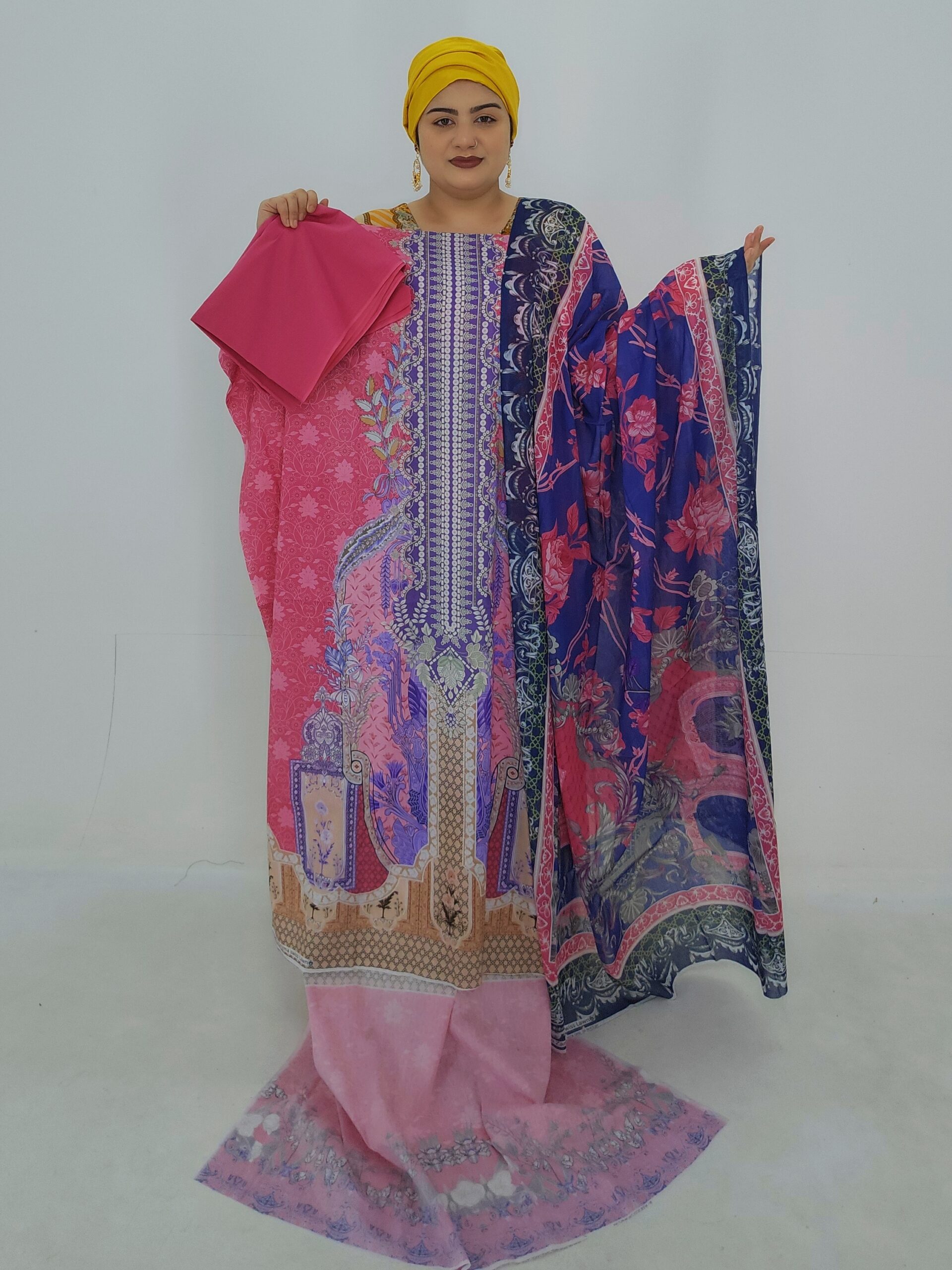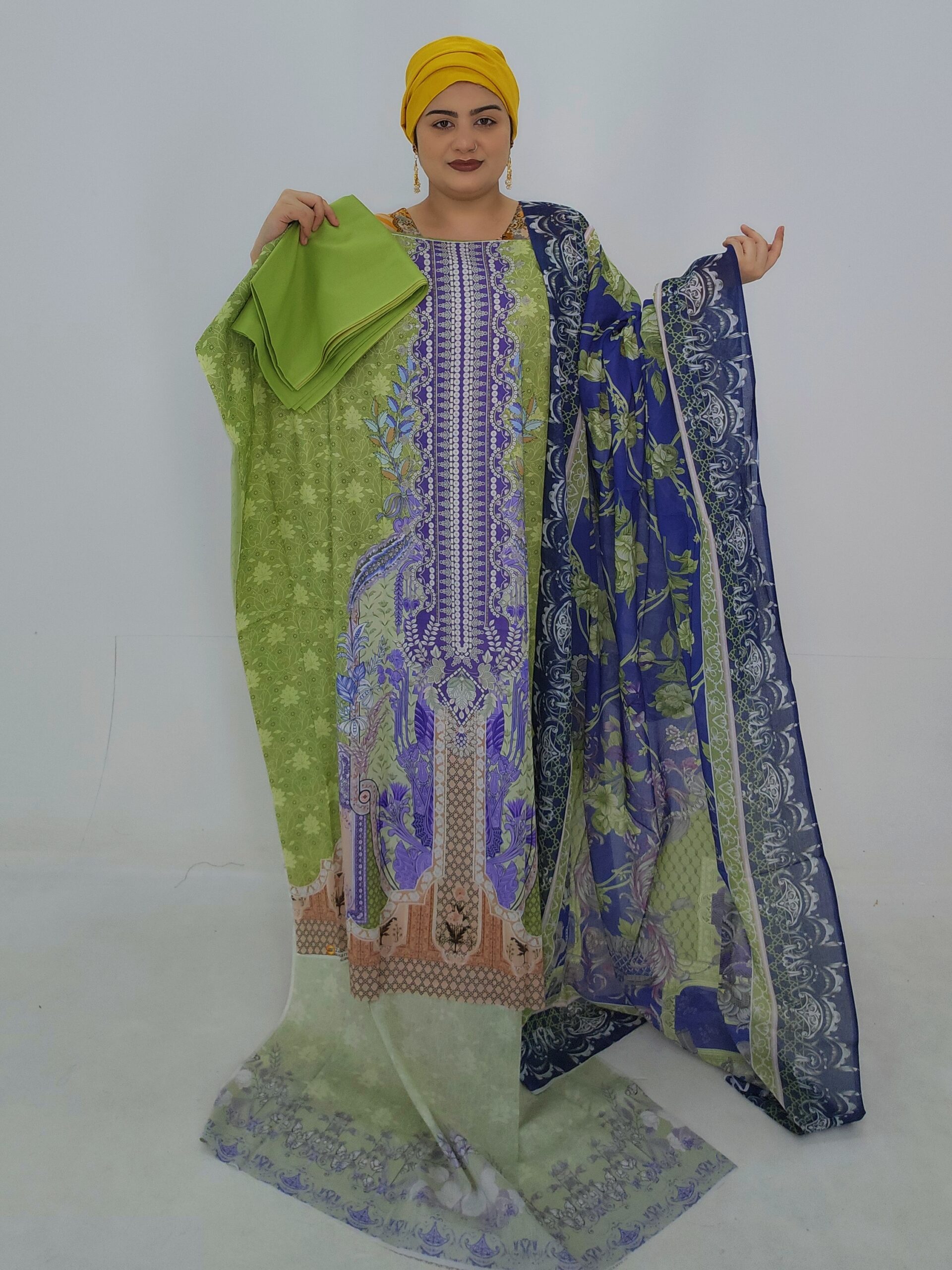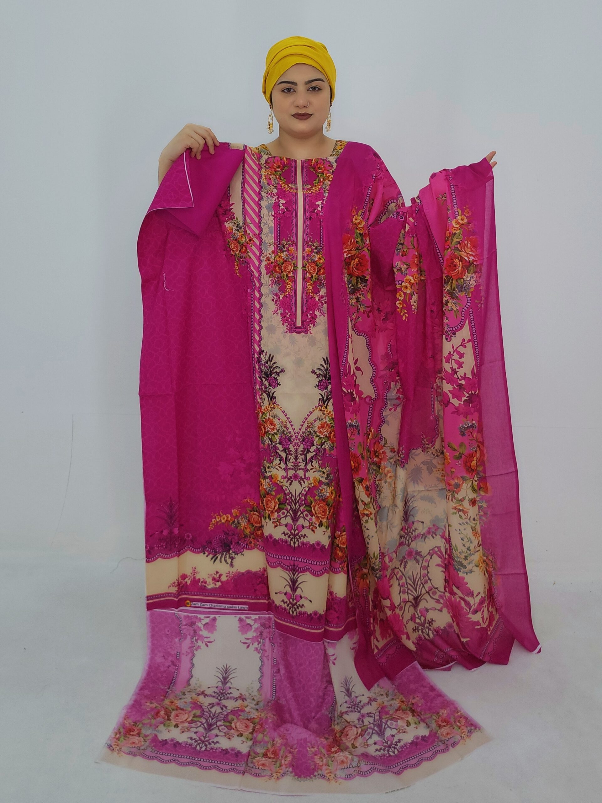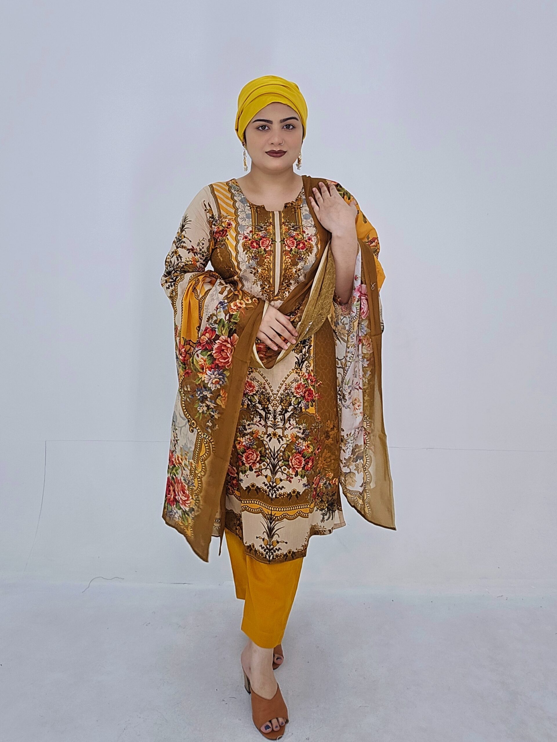 Refresh your wardrobe with this beautifully designed Digital Floral Printed Lawn Three-Piece Dress Set, crafted to deliver both comfort and vibrant style. Made from soft, breathable cotton lawn fabric with eye-catching floral prints, this outfit is perfect for daily wear, casual outings, and seasonal fashion. Its lightweight feel and elegant color combinations make it a must-have for effortless style.
