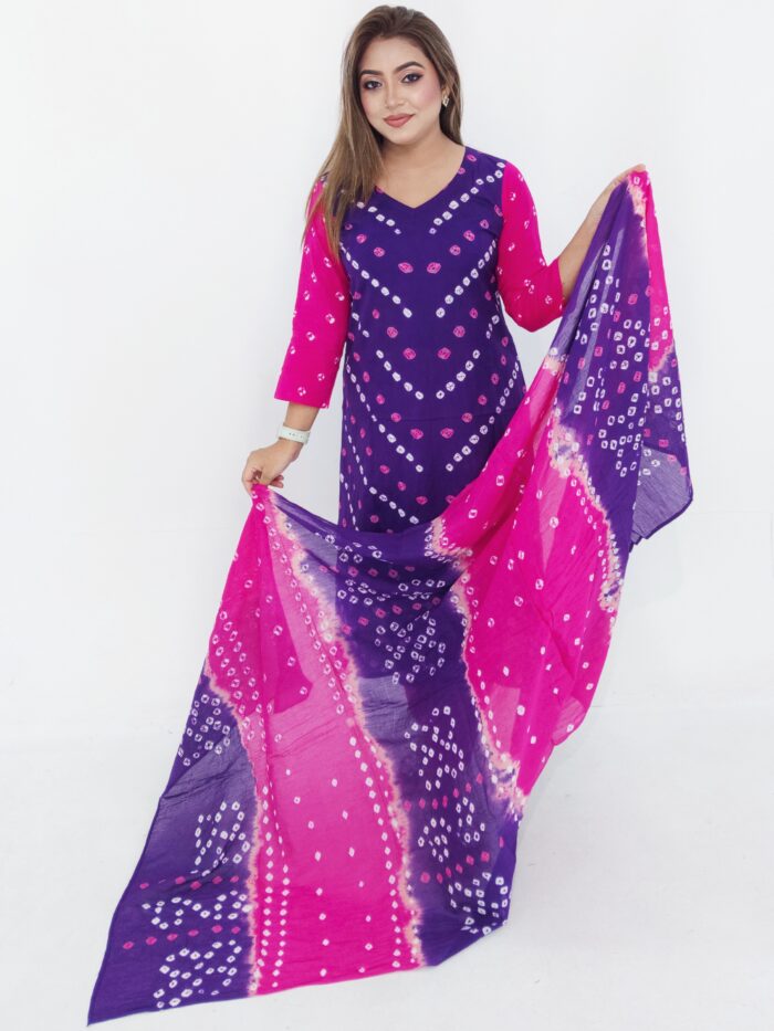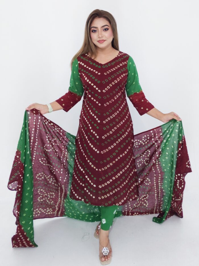 Beautiful Batik Chunri Cotton Three Piece. Soft cotton fabric with traditional chunri print. Body size up to 80 inches, dress length 46 inches. Perfect for daily & festive wear.