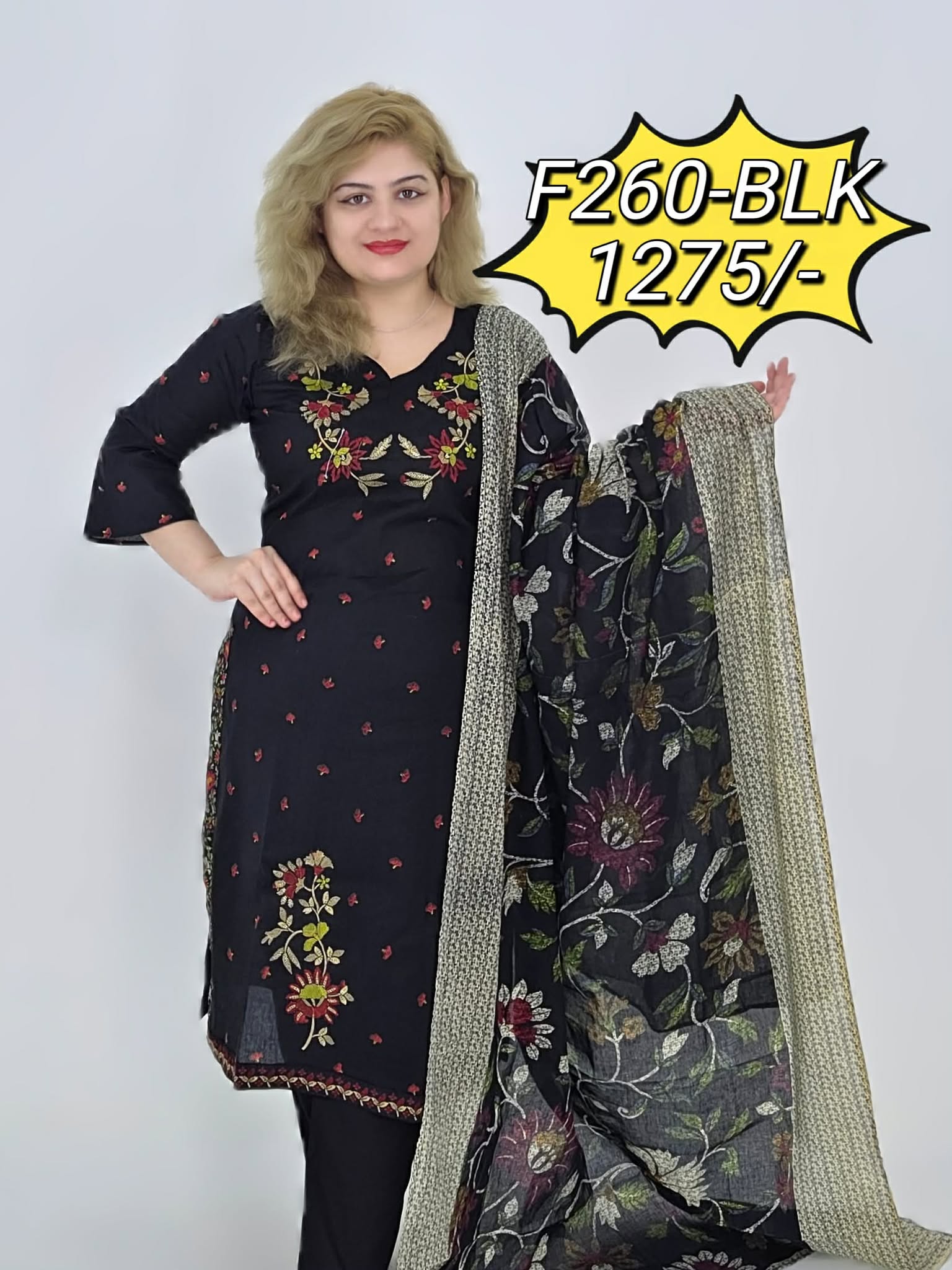 The matching dupatt a is made from printed cotton and decorated with delicate embroidery and sequence work, adding elegance and charm to the overall look. The pant fabric, also crafted from soft cotton, provides comfort and flexibility for everyday wear once stitched.