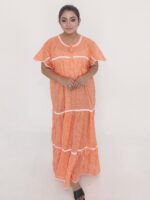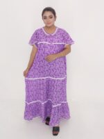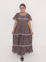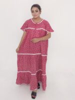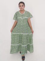 This maxi dress features a free-size body fit (maximum 50 inches) that flatters different body types while maintaining a graceful silhouette. With a length of 53 inches, it provides full coverage and a sleek, elongated look. The natural cotton material ensures superior comfort, especially suitable for warm weather in Bangladesh.