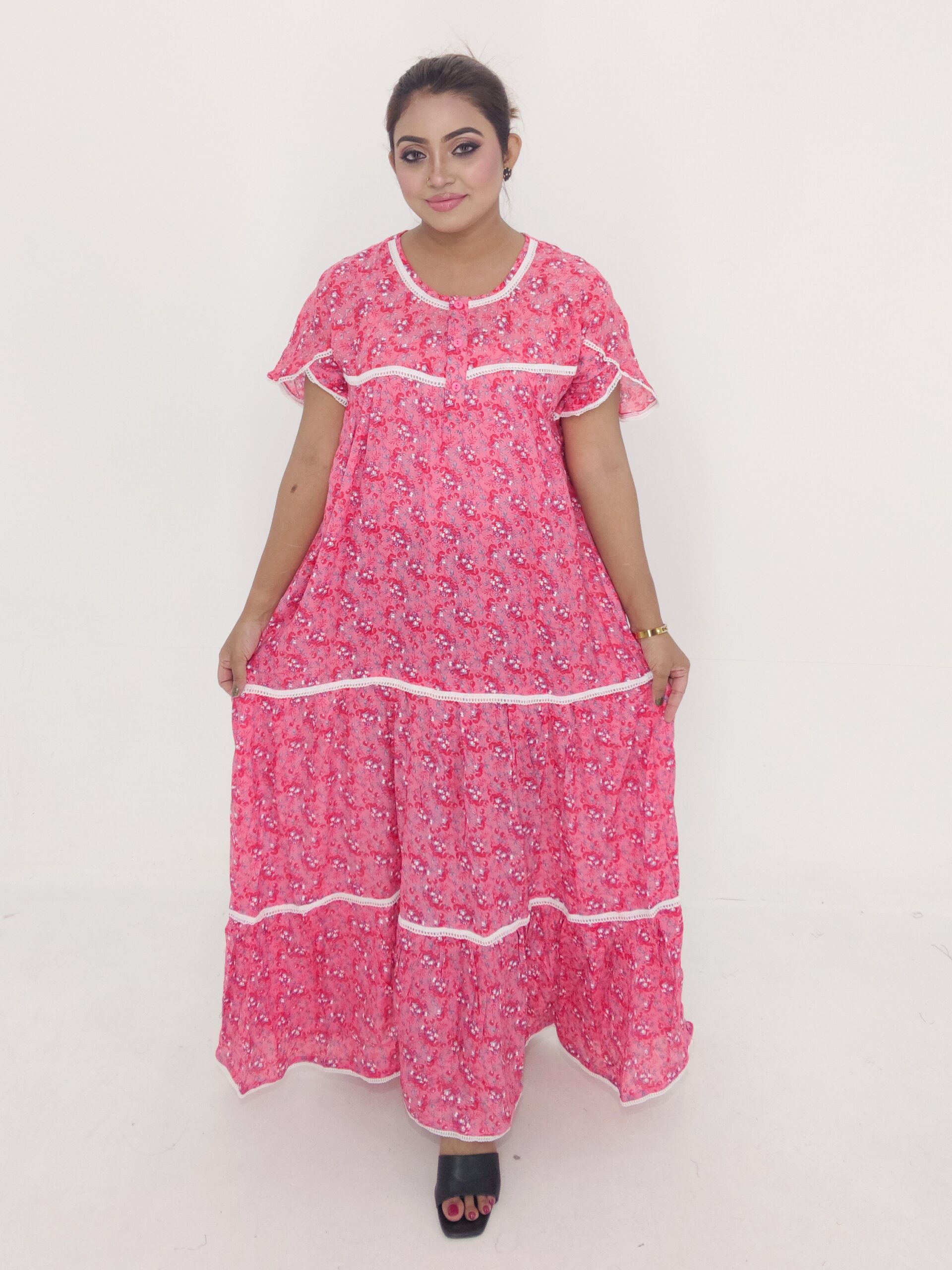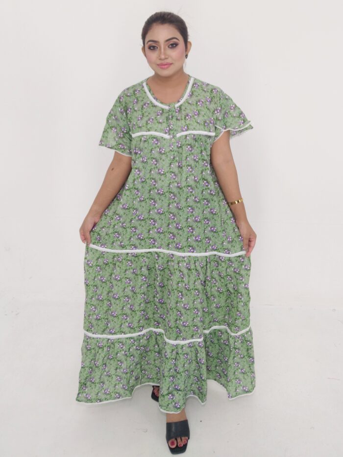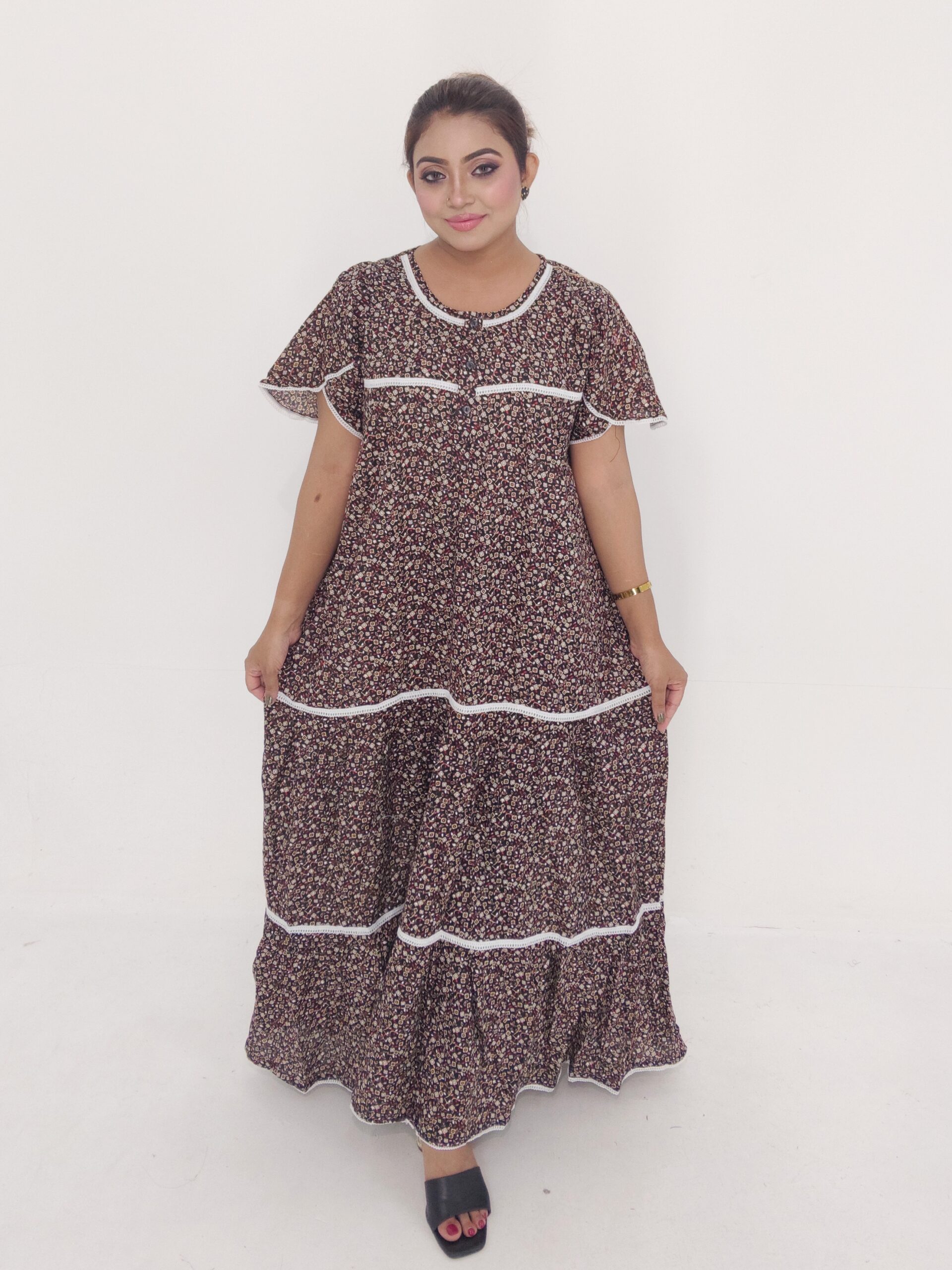This maxi dress features a free-size body fit (maximum 50 inches) that flatters different body types while maintaining a graceful silhouette. With a length of 53 inches, it provides full coverage and a sleek, elongated look. The natural cotton material ensures superior comfort, especially suitable for warm weather in Bangladesh.