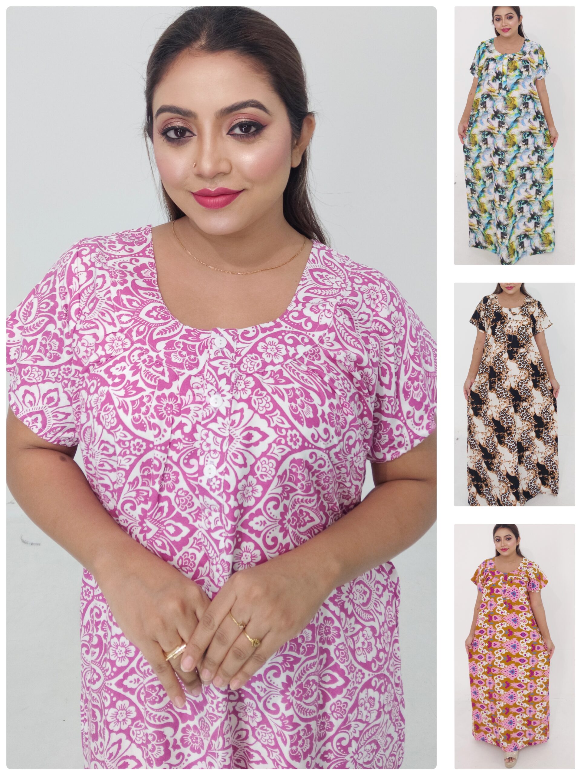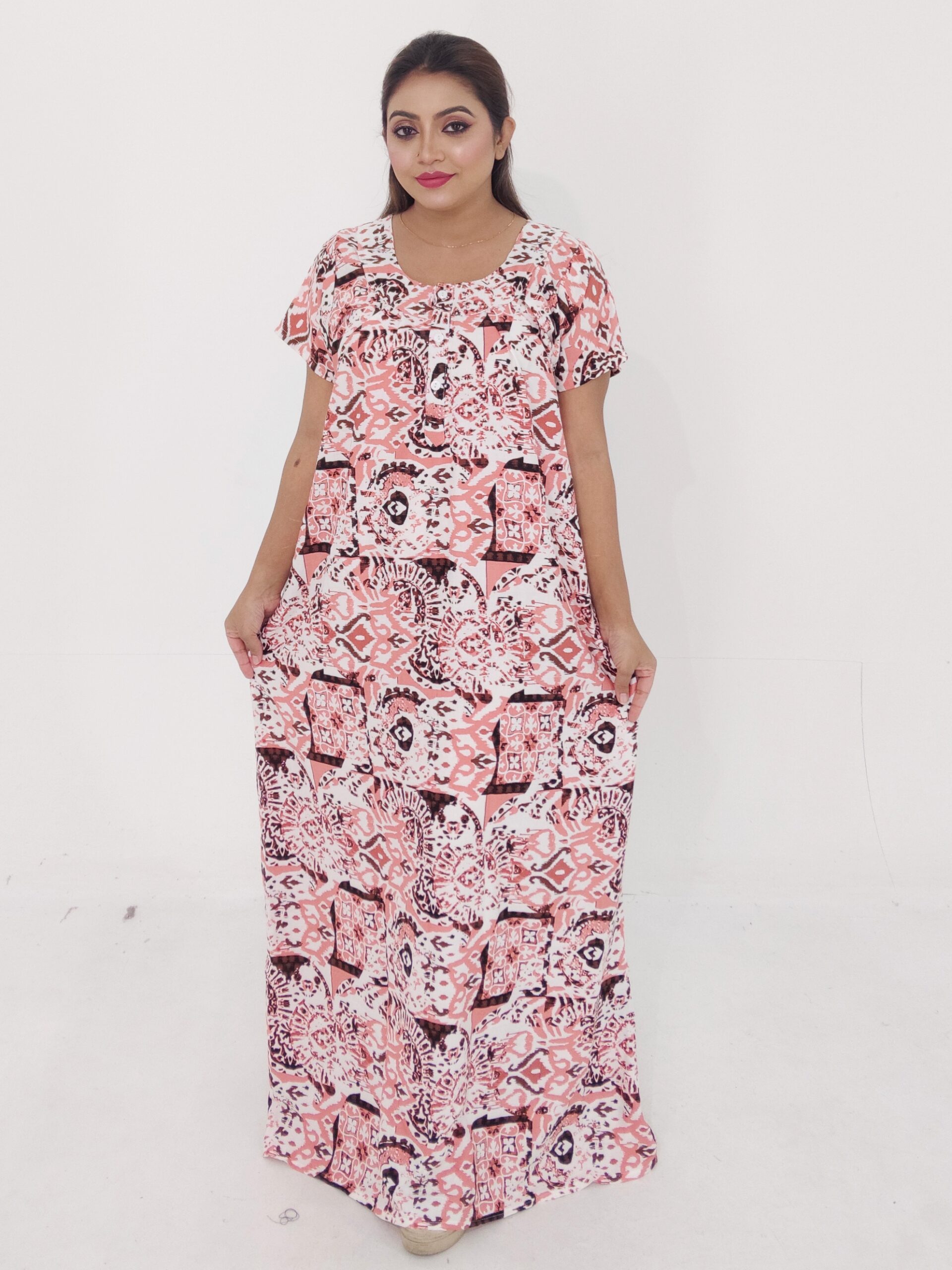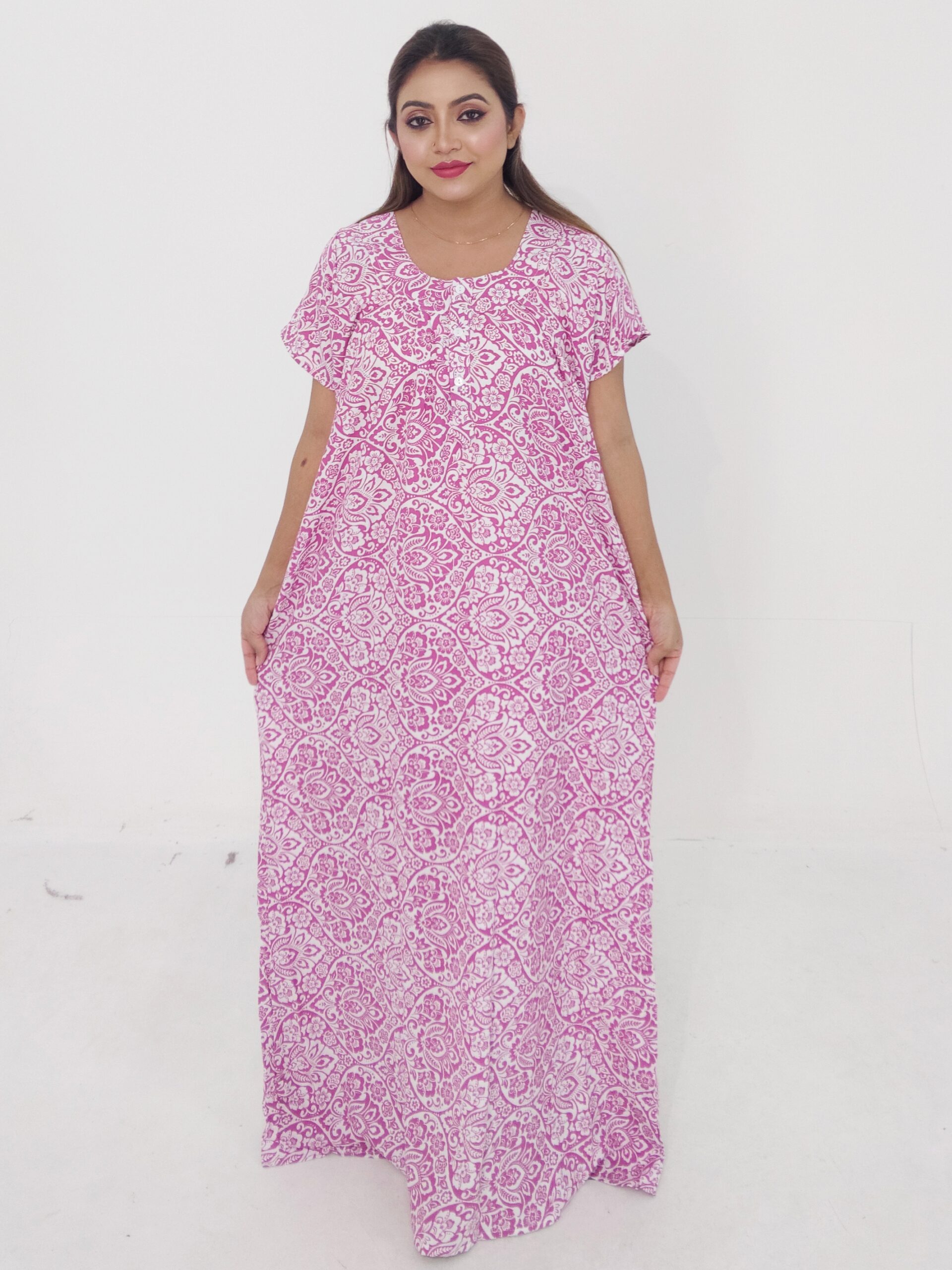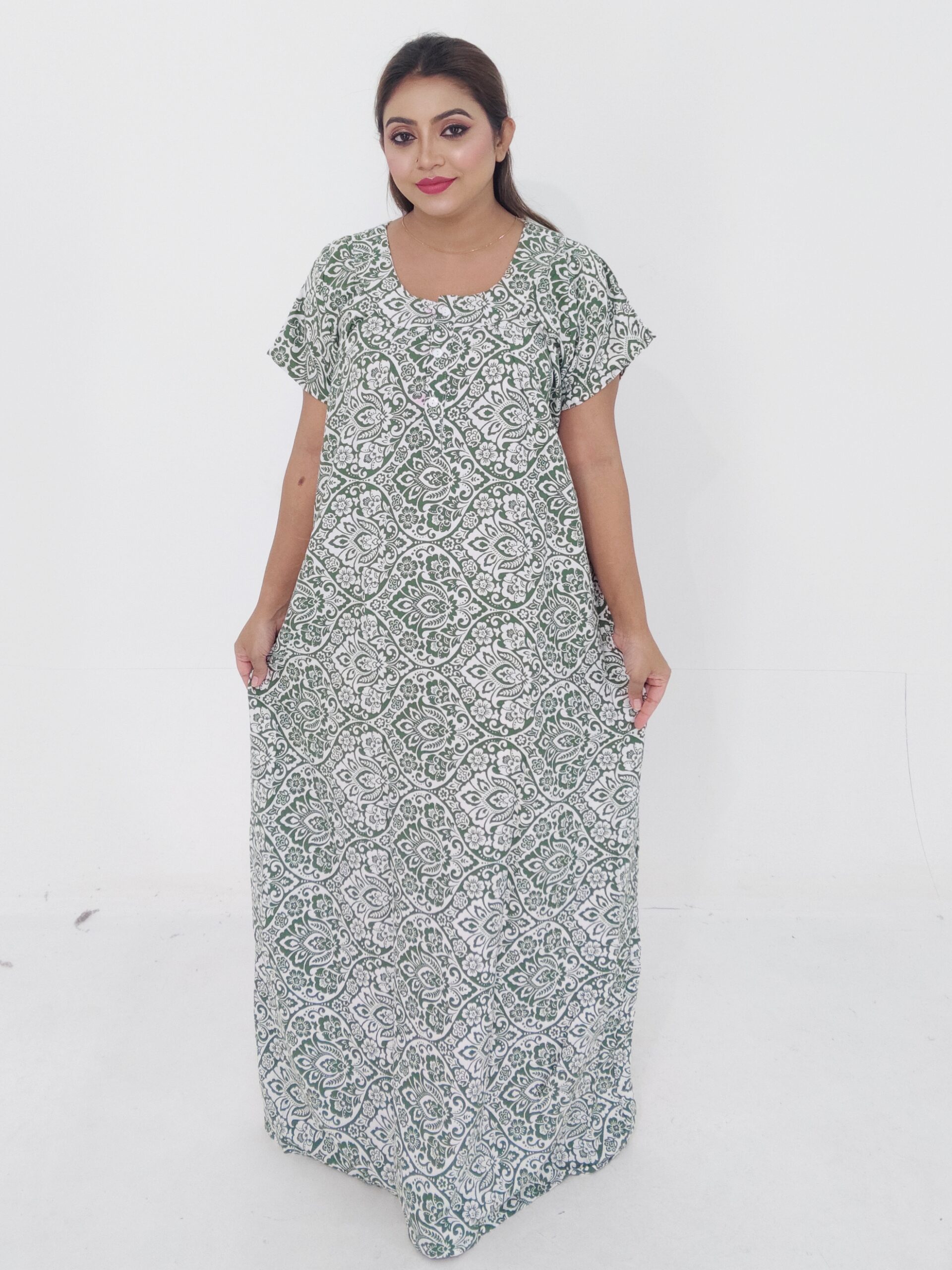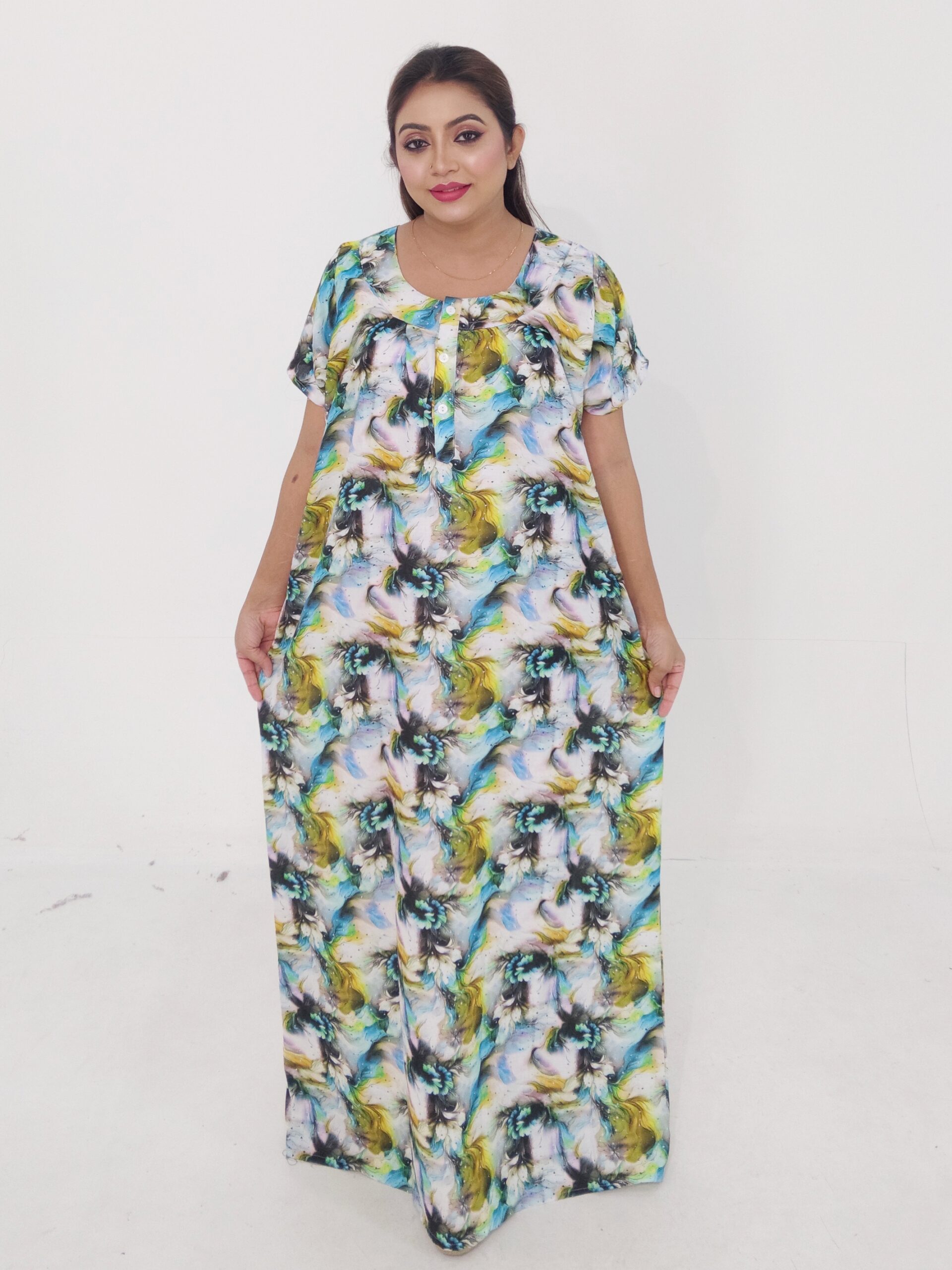 Designed in a free-size fit up to 50 inches, this maxi dress offers flexibility and comfort for a wide range of body shapes. The 56-inch length ensures a graceful, floor-length appearance while maintaining ease of movement. Perfect for casual outings, work-from-home comfort, parties, or relaxed outdoor events, this dress gives you a chic, effortless look without compromising on comfort.