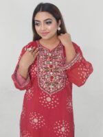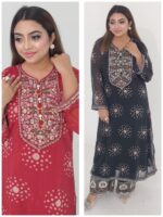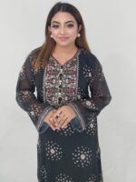 The beautiful floral print is enhanced with fine embroidery and sequence work, creating a graceful and eye-catching look. The readymade design ensures easy wear, while the body size range of 38–46 inches provides a comfortable and flattering fit. With a 47-inch kameez length and 39-inch pant length, this outfit delivers a perfect balance of style and comfort.