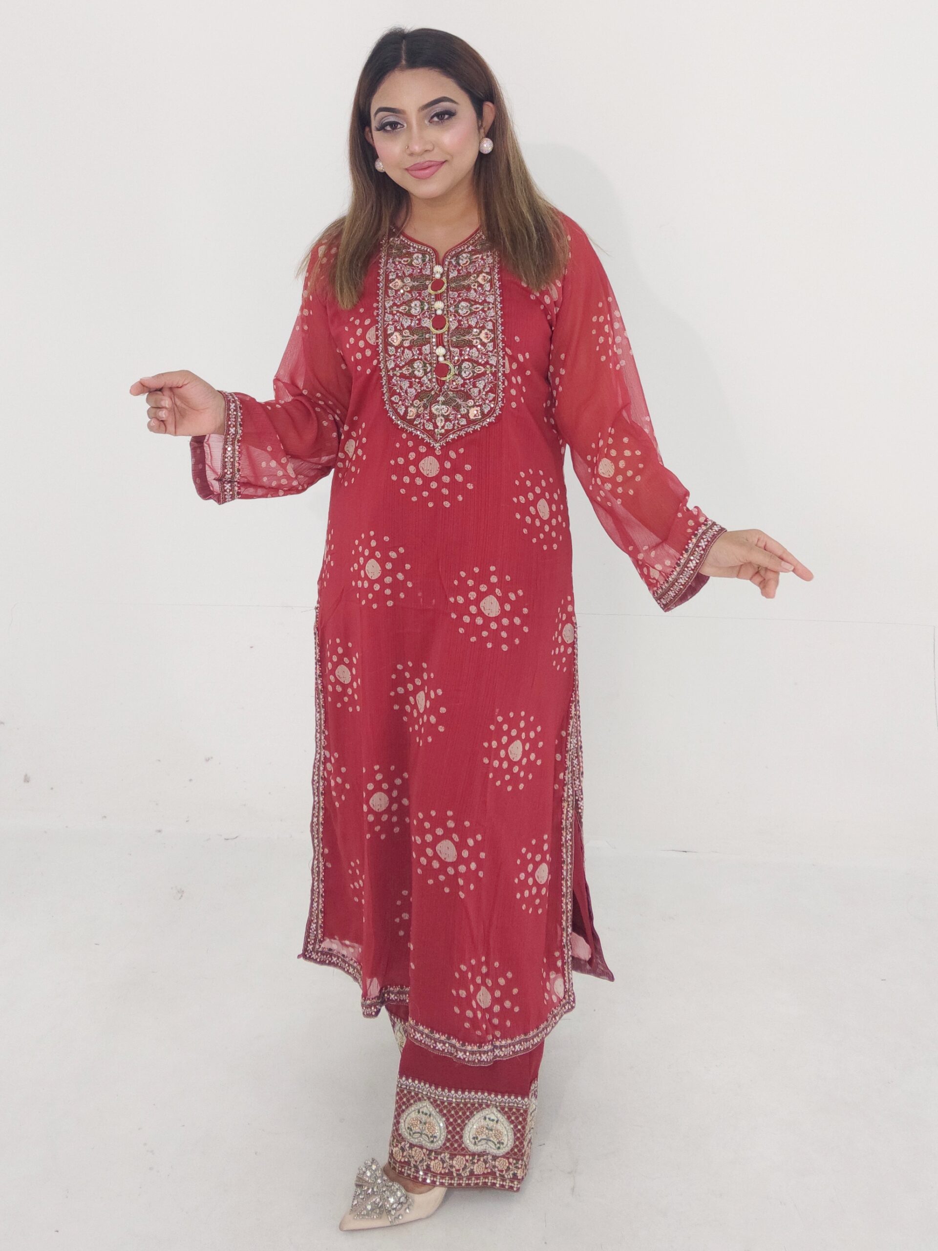This Soft Chiffon Georgette Readymade 3 Piece is designed for women who love elegant and premium outfits. Crafted with soft chiffon georgette as the outer fabric and butter silk inner lining, this dress offers both comfort and a luxurious feel.