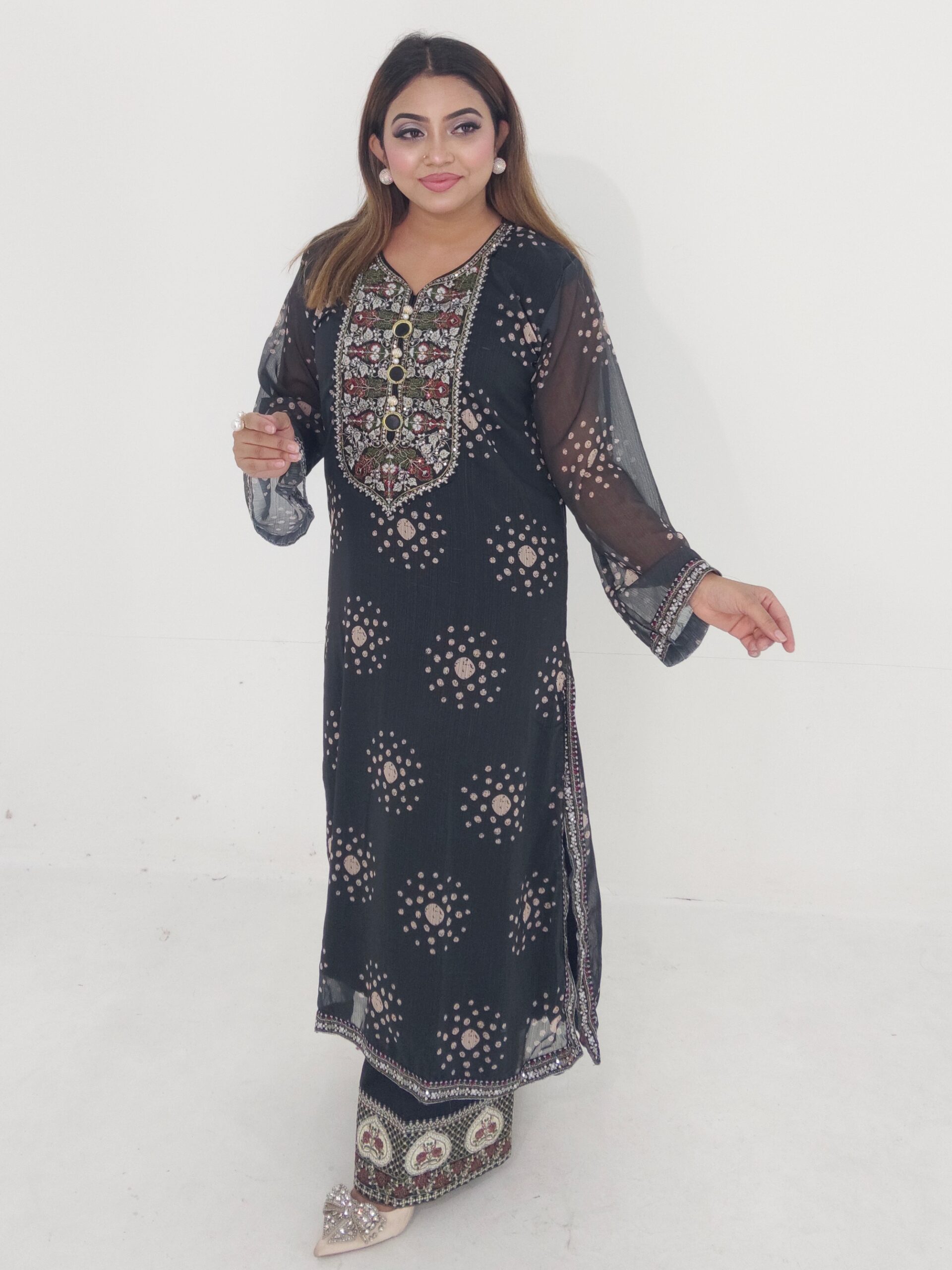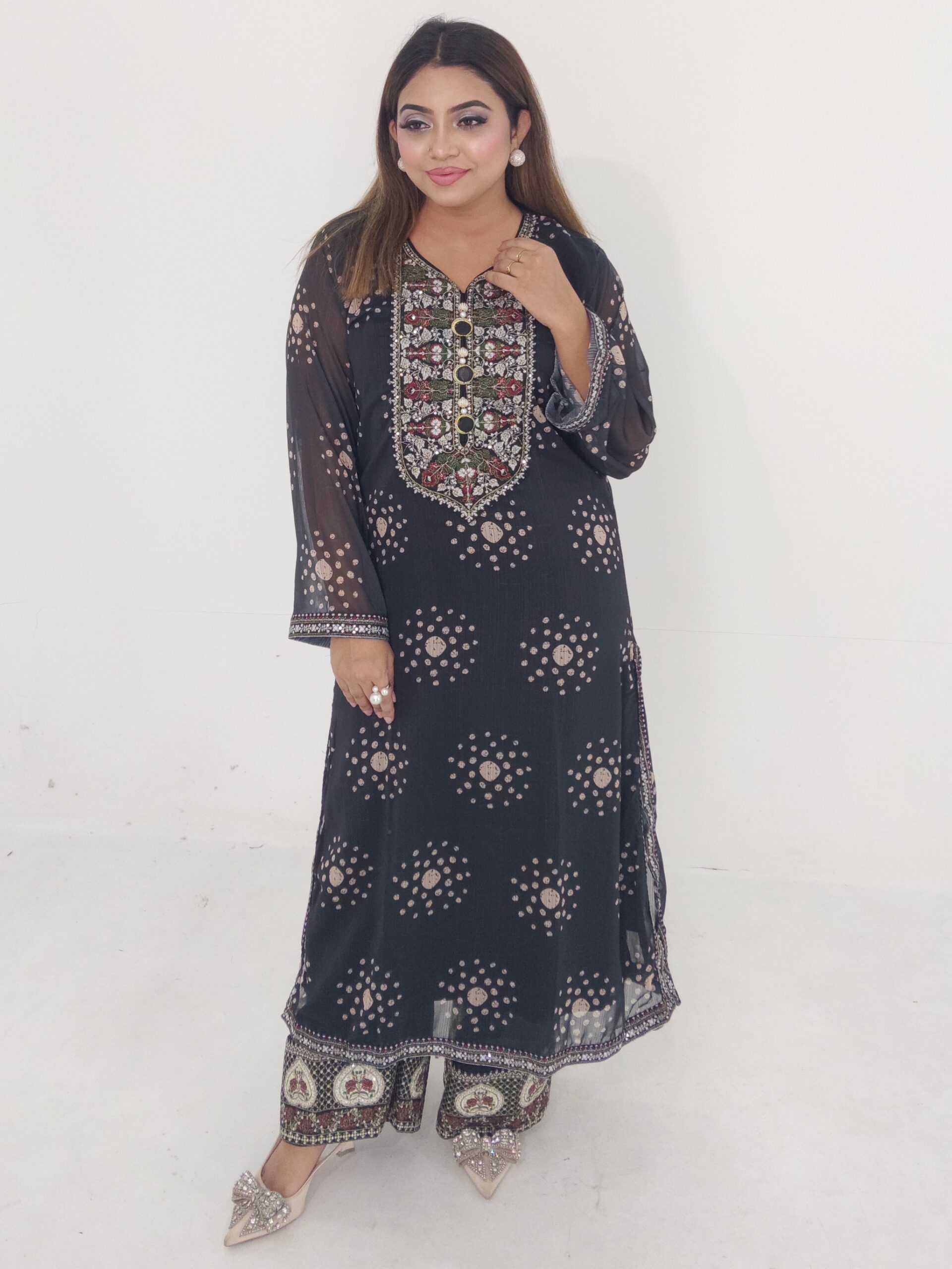 Elegant floral print combined with delicate embroidery and sequence work, giving a classy and premium party-wear look.