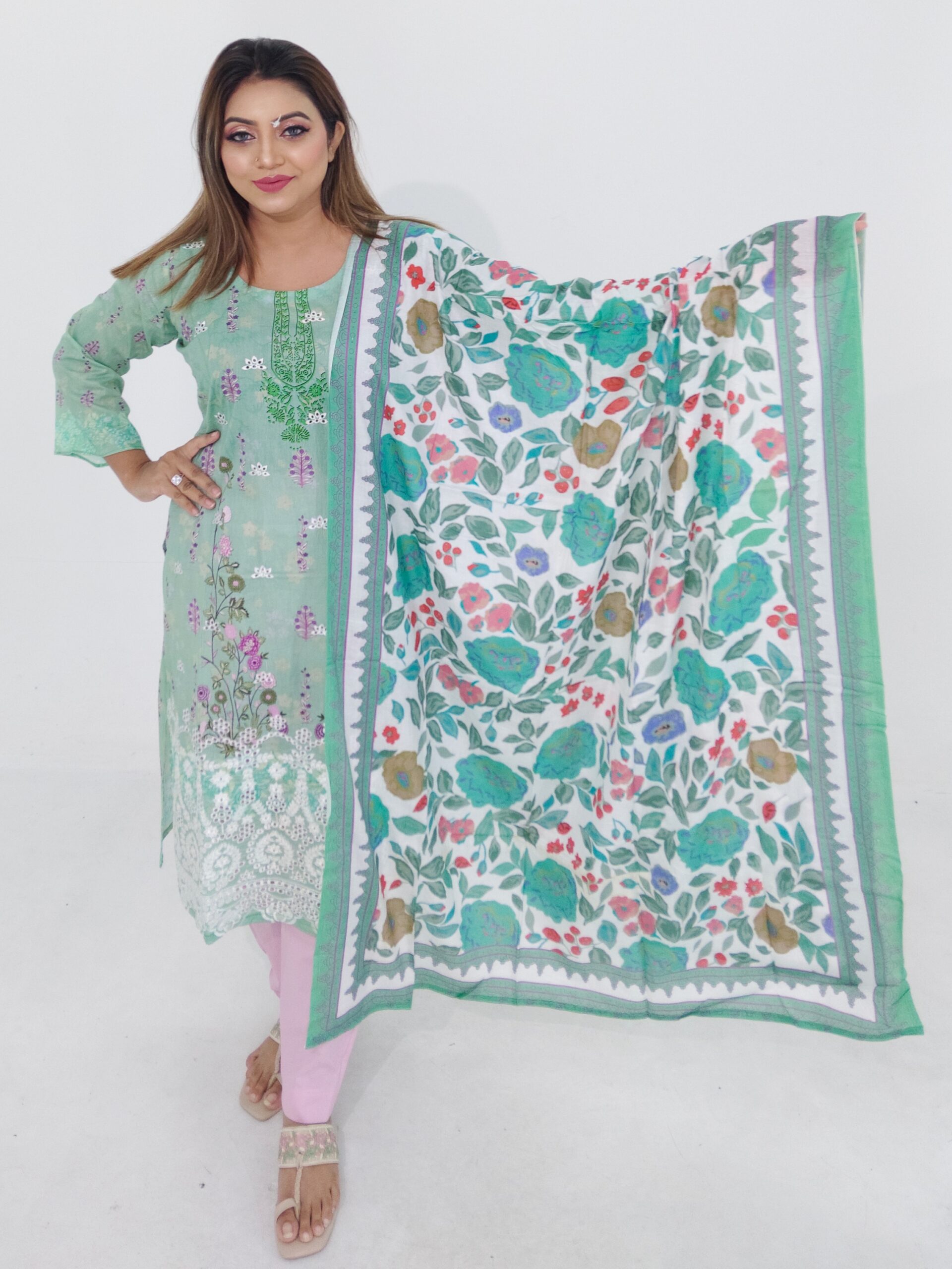 The kameez features a beautiful floral design highlighted with detailed embroidery and refined cut work, adding a graceful and boutique-inspired look. The embroidery enhances the overall appeal without making the outfit heavy, while the cut work adds a delicate finishing touch. The matching cotton dupatta complements the kameez design, and the plain cotton salwar or pant ensures comfort and balance.
