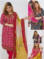 Premium cotton unstitched dress with embroidery and sequence work. Includes kameez, dupatta, and