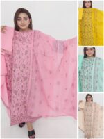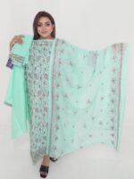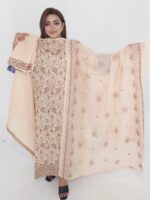 Exquisite Craftsmanship Meets Everyday ComfortIntroducing a gorgeous addition to the Aroby’s Collection lineup: the luxurious Cotton Embroidery Sequence Three Piece suit. This traditional boutique dress perfectly balances festive glamour with wearable comfort, making it an essential piece for your collection. Unlike heavy synthetic party wear, this suit is crafted from premium pure cotton fabric, ensuring exceptional breathability and ease of wear, even during long events.Design Details That ShineThe true highlight of this unstitched party wear suit is the intricate detailing. The entire kameez fabric is adorned with fine cotton embroidery, beautifully complemented by subtle, shimmering sequence work. This hand-finished detailing catches the light elegantly, providing a sophisticated sparkle without being overly flashy. This careful blend of thread work and sequences is characteristic of high-end traditional craftsmanship. The base color (assuming the “white” in your details means the primary color) makes the colorful embroidery pop, offering a fresh and bright look perfect for daytime ceremonies or evening gatherings.Freedom to Tailor Your Perfect FitBeing an unstitched three piece, this suit offers you the ultimate freedom to customize the fit to your liking. With a generous $\text{76}$-inch fabric for the body and a $\text{47}$-inch length for the kameez, you have ample material to design a suit that flatters your unique body shape. You can choose your neckline, sleeve style, and silhouette, ensuring a garment that looks professionally tailored just for you. This guarantees maximum comfort and a bespoke feel that ready-to-wear simply cannot match.The Perfect EnsembleThis complete three-piece set typically includes the fully embroidered kameez, a complementary bottom fabric (cotton), and a matching dupatta, often with border details to complete the look. Whether you’re attending a family wedding, a celebration, or a semi-formal dinner, this Cotton Embroidered Dress guarantees you’ll stand out with grace and style. Shop this elegant piece now on the Aroby’s Collection website and experience the perfect marriage of comfort and festive tradition.