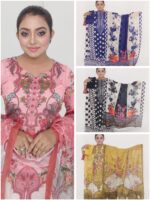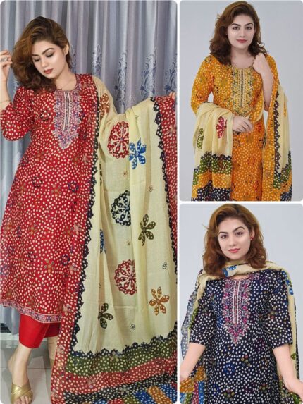 The lightweight cotton fabric allows excellent breathability, making it suitable for long wear during hot summer days. The floral patterns are digitally printed, ensuring long-lasting colors that won’t fade easily. This set includes three pieces — a kameez, dupatta, and salwar — giving you the flexibility to customize your own fitting and style.