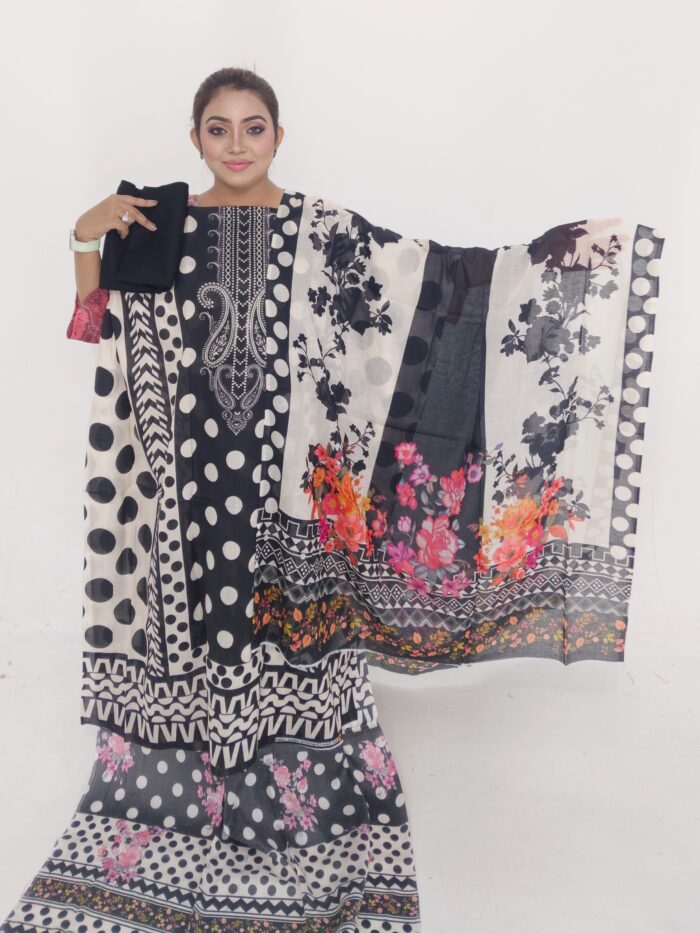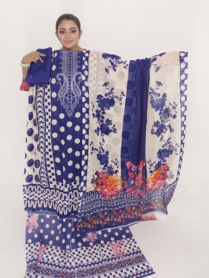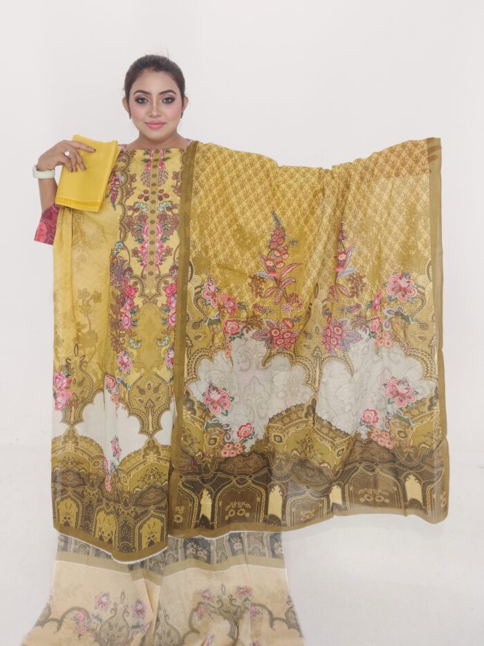 The lightweight cotton fabric allows excellent breathability, making it suitable for long wear during hot summer days. The floral patterns are digitally printed, ensuring long-lasting colors that won’t fade easily. This set includes three pieces — a kameez, dupatta, and salwar — giving you the flexibility to customize your own fitting and style.