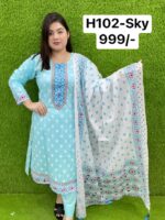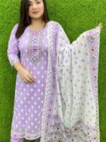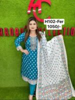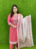 The kameez features a beautiful Jamdani-inspired skin print enhanced with delicate embroidery work, creating a refined and graceful look. The matching cotton dupatta also comes with coordinated Jamdani pattern skin print, adding harmony and elegance to the complete outfit. The plain cotton pant balances the detailed upper pieces, ensuring both comfort and style.