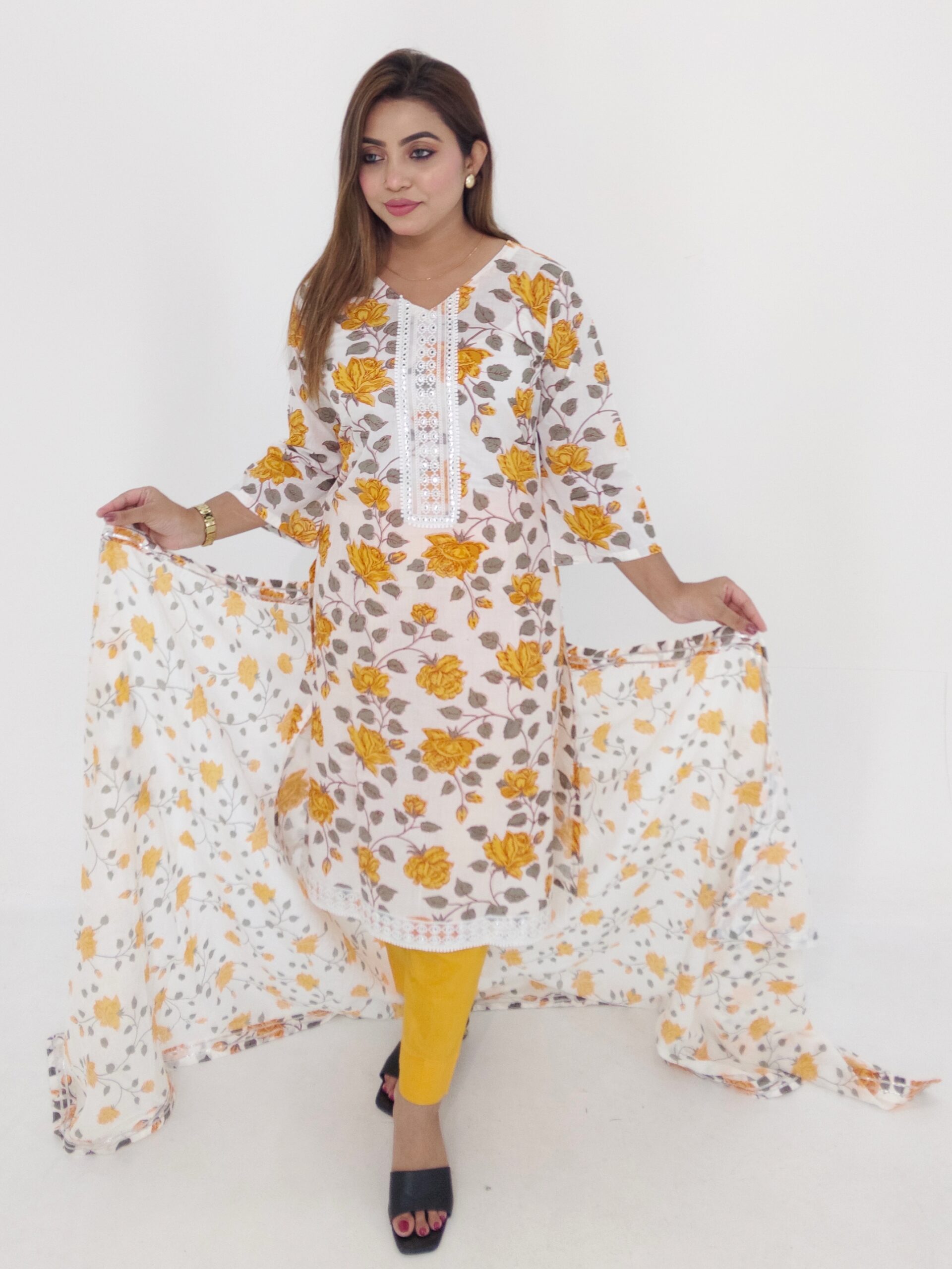 Breathable Cotton Kamij Set with Plain Pant & Printed Dupatta