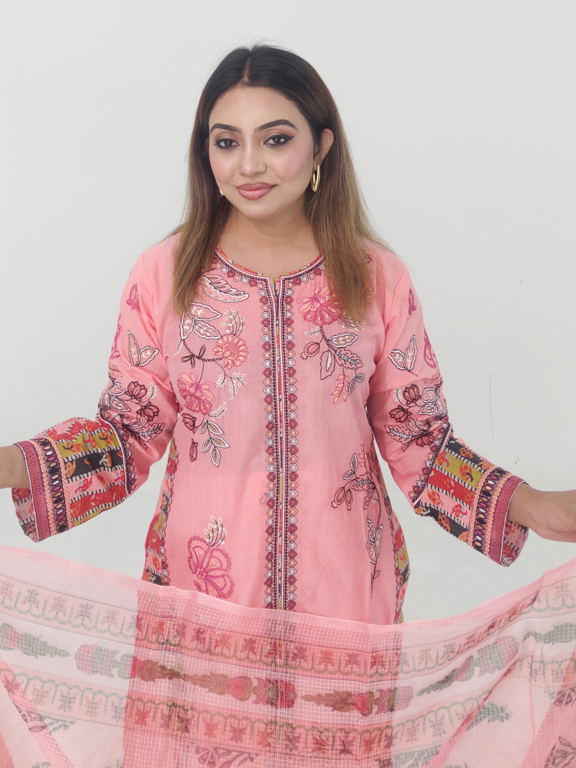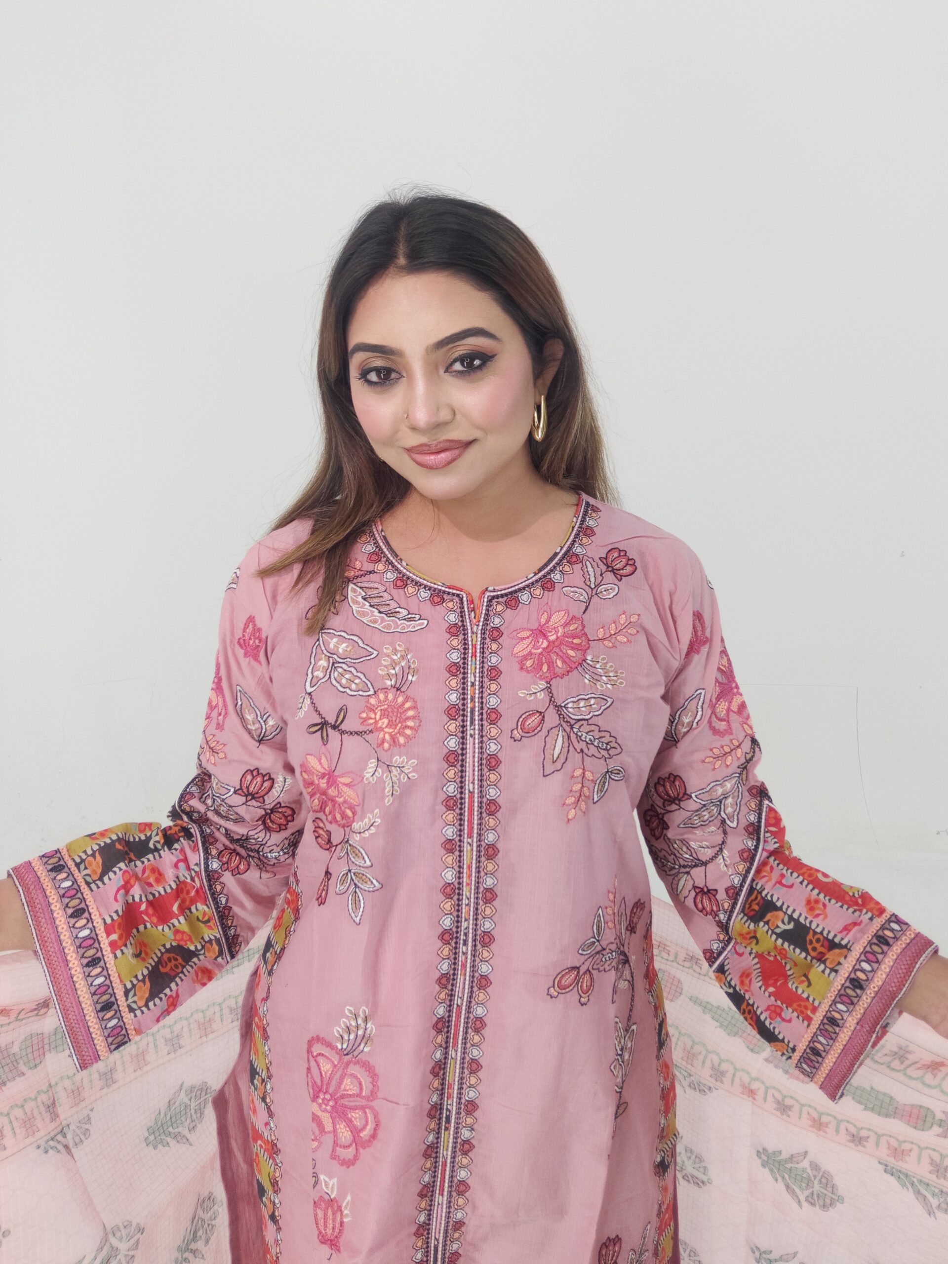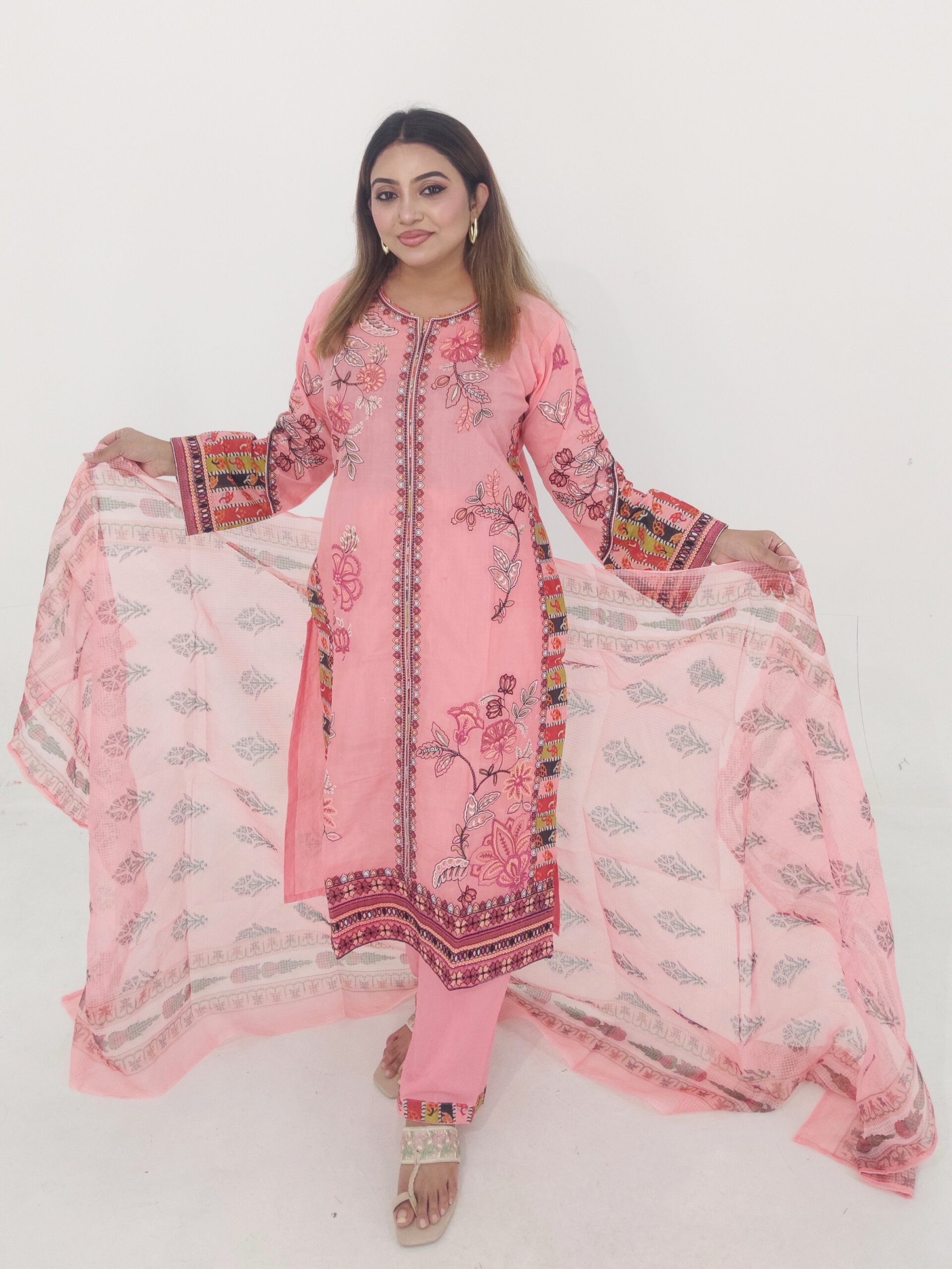 Enhance your everyday style with this elegant Cotton Readymade 3 Piece with Embroidery Work. Crafted from premium quality cotton fabric, this outfit offers excellent comfort, breathability, and softness, making it ideal for daily and office wear.