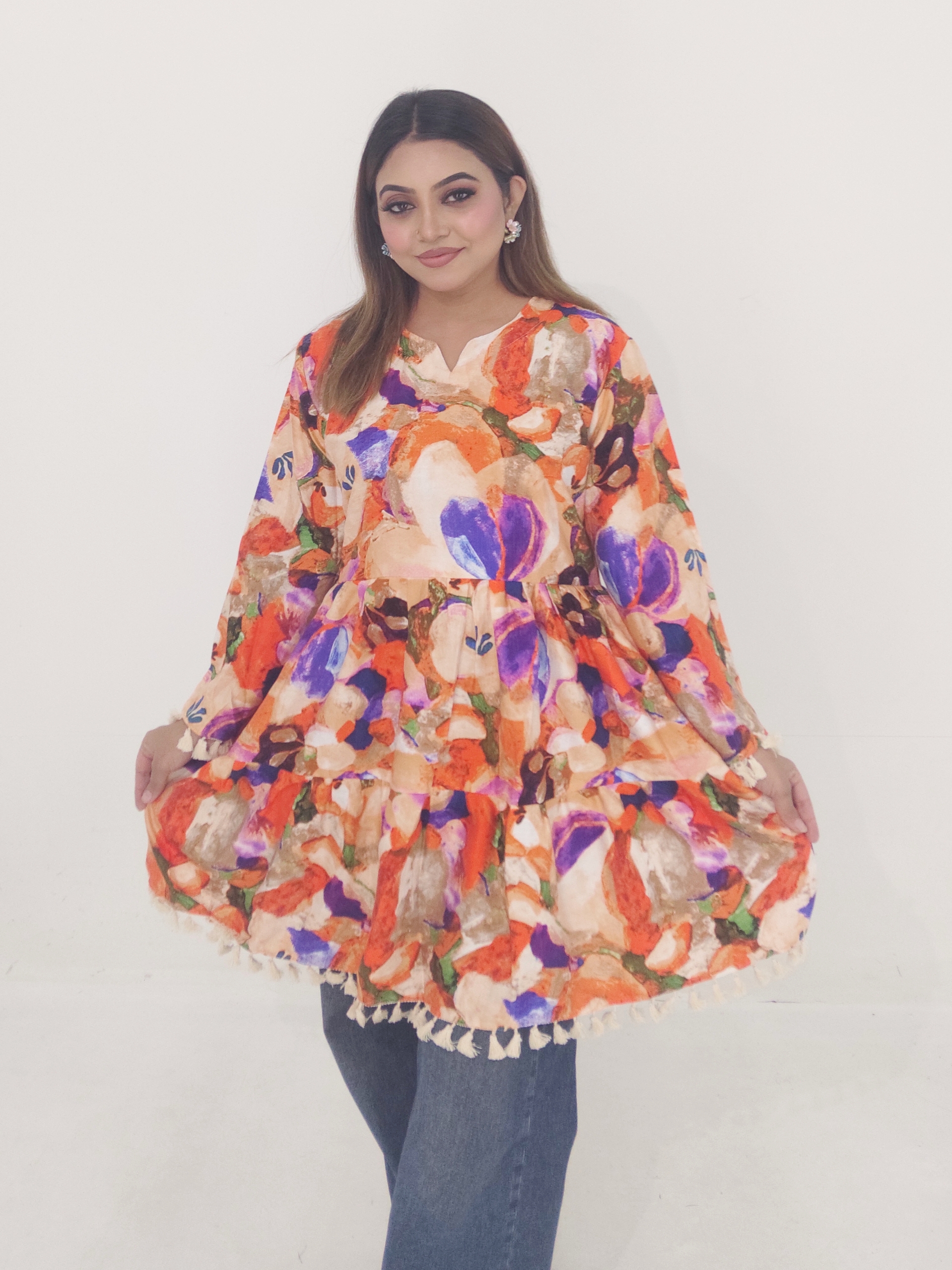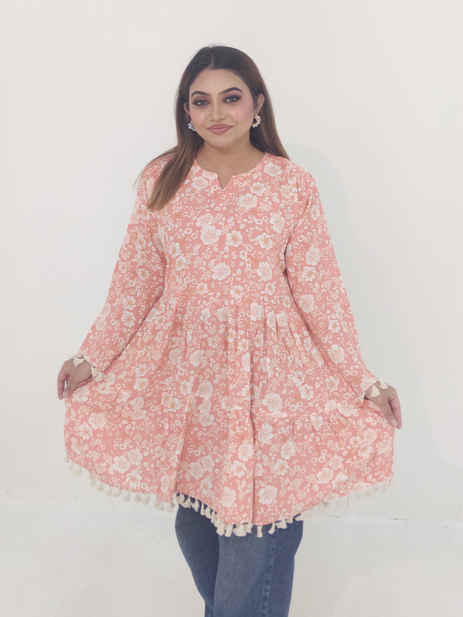 The beautiful floral print adds a fresh and feminine charm, while the generous 82-inch gher (flare) gives a graceful flow and stylish look. With a comfortable body size range of 36–42 inches and a 34-inch length, this readymade top offers a flattering fit without any tailoring hassle.