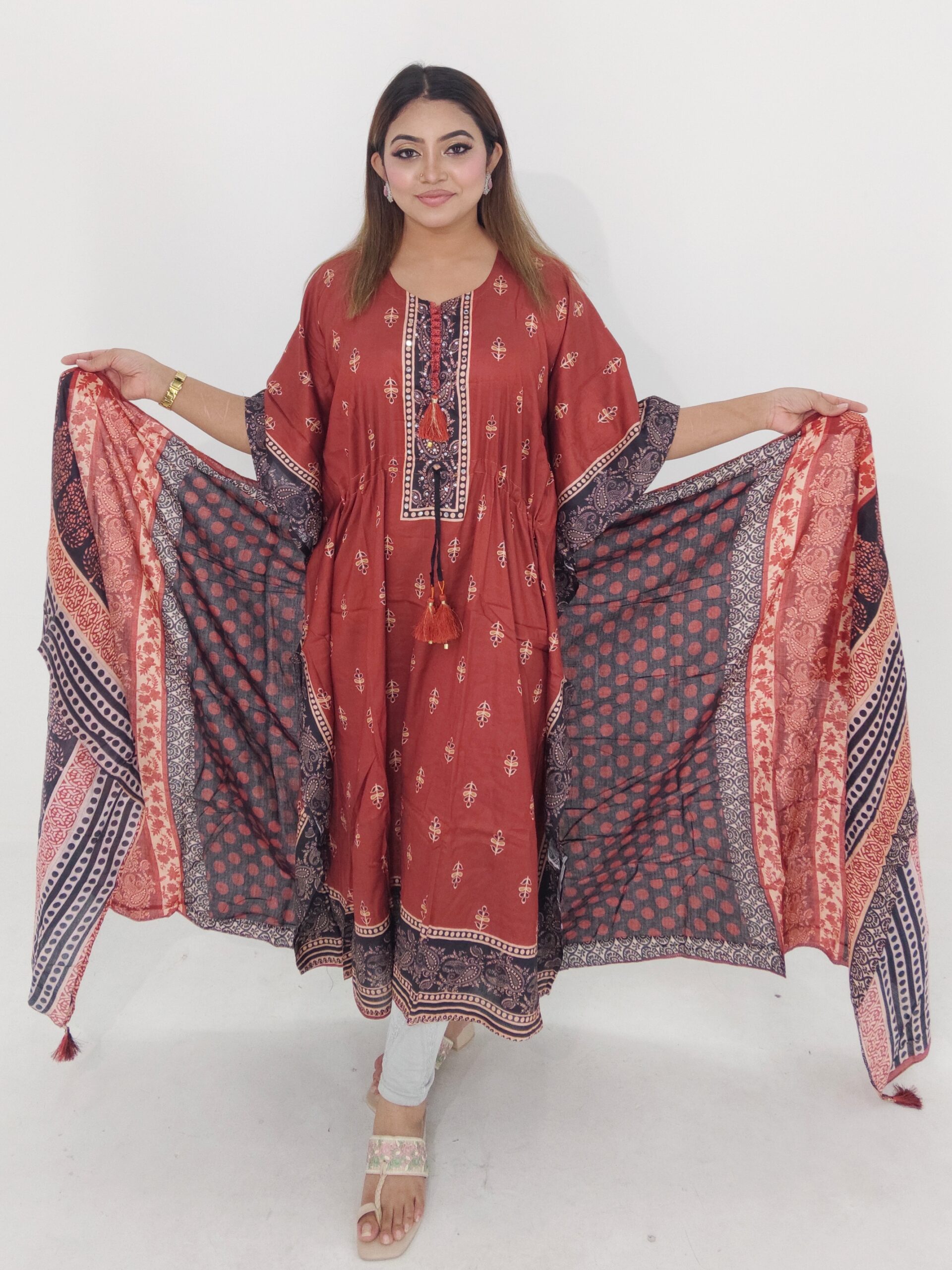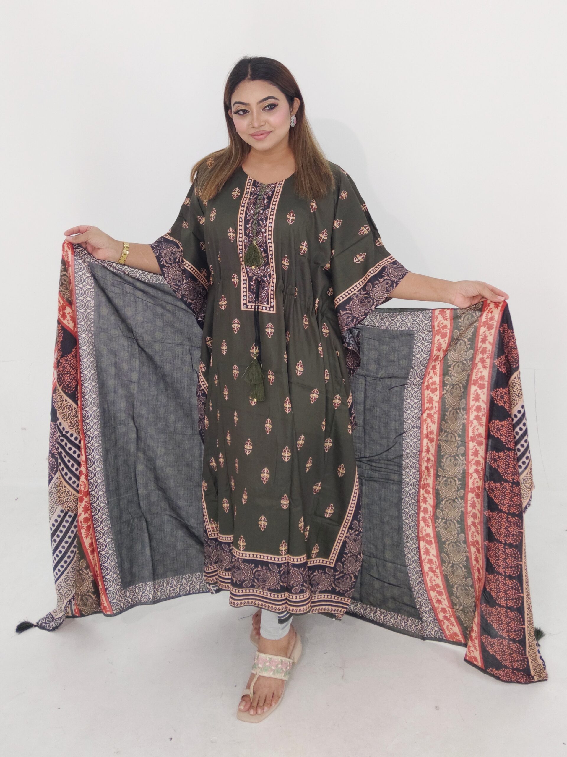 Stylish kaftan design enhanced with beautiful mirror work that adds a festive and elegant touch while keeping the outfit comfortable and breathable.