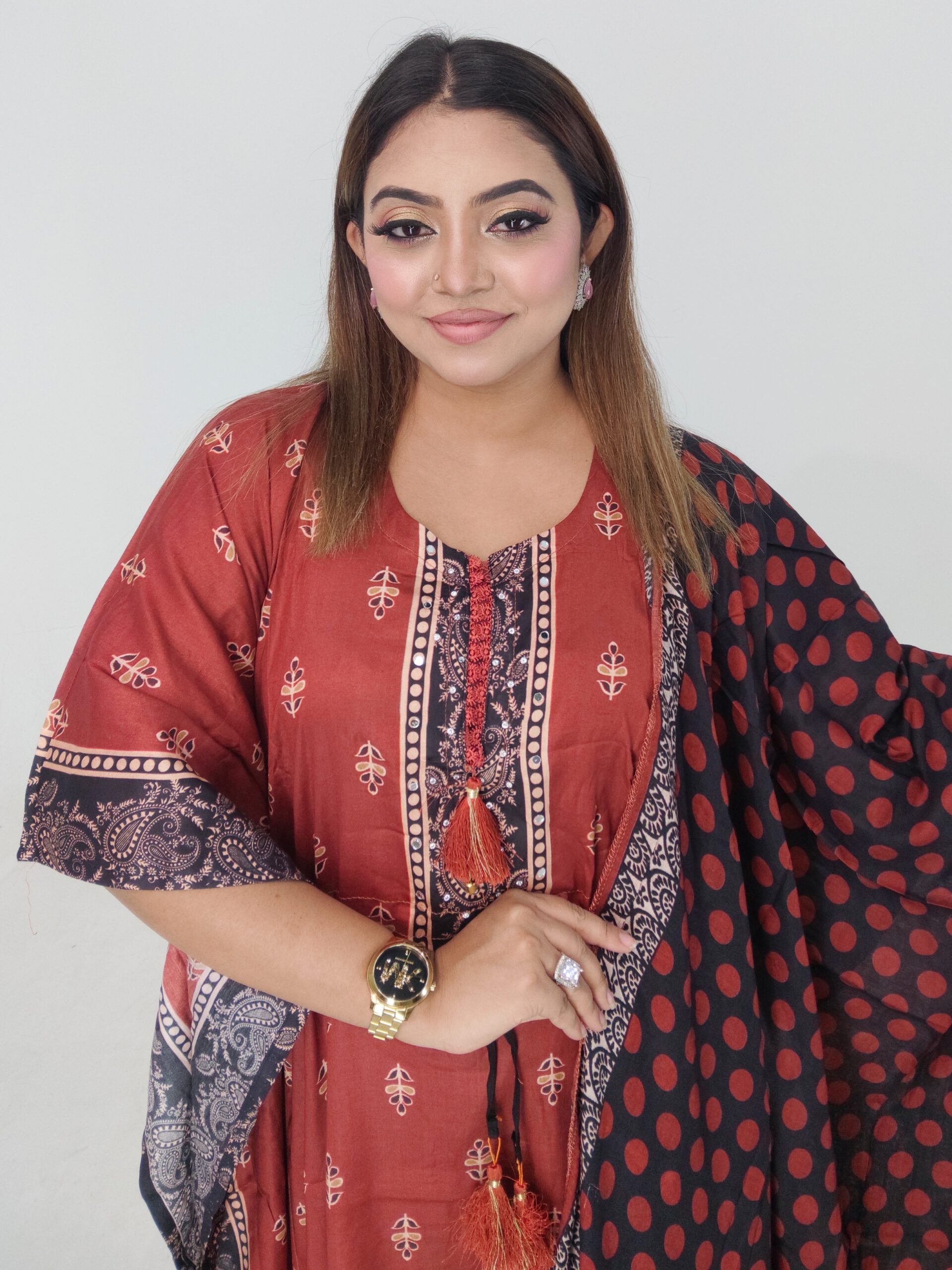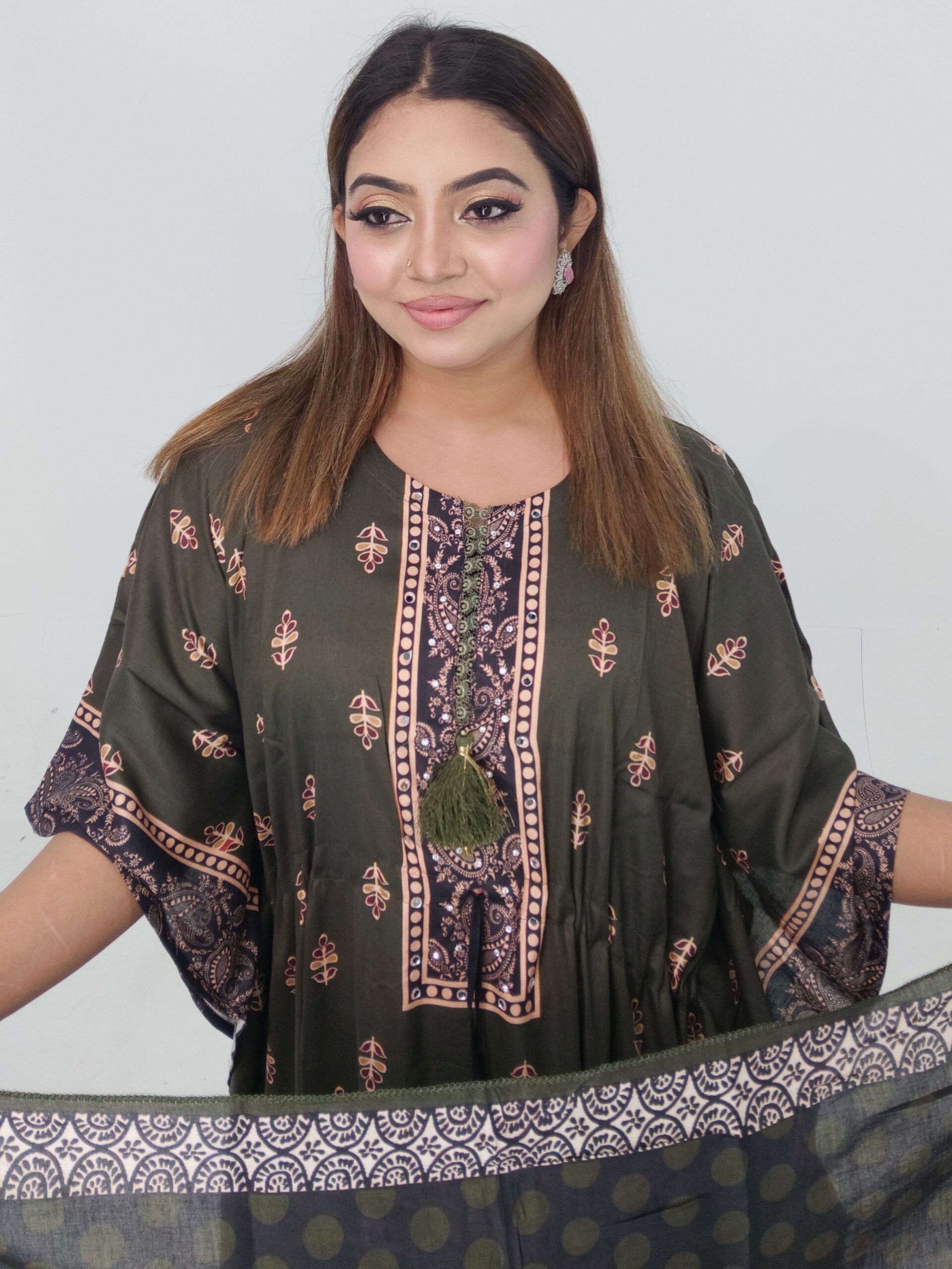 Designed in a free-size fit that comfortably accommodates up to 46 inches, this kaftan offers a relaxed yet flattering silhouette. The 46-inch length provides graceful coverage and flow, making it ideal for daily wear, family programs, or casual outings.