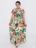 With a free body size fitting up to 50 inches and a length of 53 inches, this maxi offers comfort without compromising on elegance. The flowy cut and breathable material allow easy movement, making it a must-have for your seasonal collection. Pair it with heels or flats to complete your chic and graceful look.