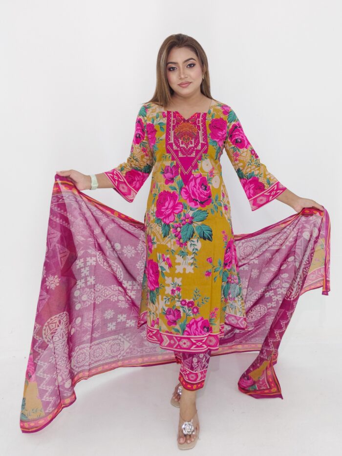 Upgrade your wardrobe with this elegant Cotton Digital Print Unstitched 3 Piece Dress, designed for women who love comfort and style in one outfit. Crafted from high-quality cotton fabric, this unstitched dress set offers both durability and breathable comfort, making it ideal for everyday wear in Bangladesh’s weather.