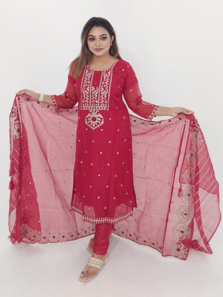 The beautifully embroidered cotton kameez adds a refined touch, while the plain cotton pant keeps the look balanced and comfortable. The printed cotton dupatta enhances the overall outfit with a graceful finish. With a generous body size up to 76 inches and a 47-inch kameez length, this unstitched 3 piece allows you to tailor the dress according to your preferred fitting and style.
