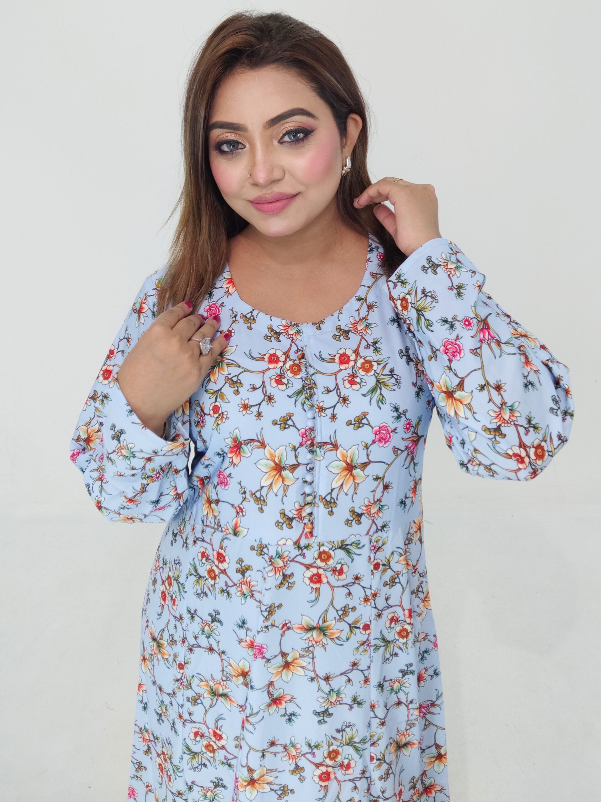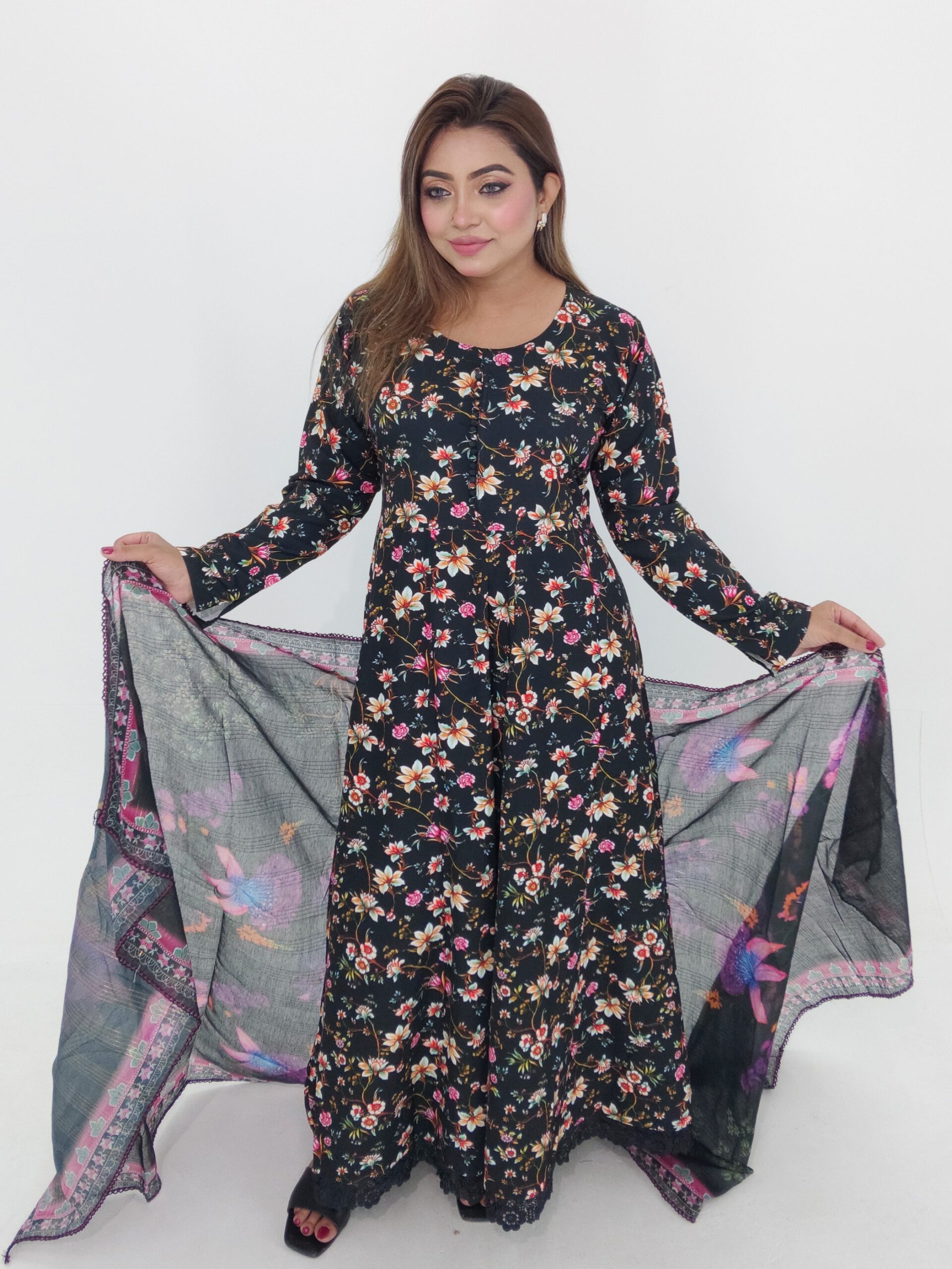 With body sizes ranging from 40–44 inches and a gown length of 51 inches, this outfit fits beautifully and ensures comfort for long wear. The high-quality Dubai Silk fabric adds durability while maintaining an elegant drape that flows gracefully with every step.