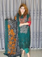 Experience luxury with our unstitched cotton 3-piece, highlighting exquisite embroidery. The Kamij showcases stunning boring style embroidery and sequin embellishments on digitally printed cotton. A matching printed cotton dupatta with embroidery and a soft cotton pant complete this sophisticated ensemble. Perfect for creating a tailored fit. Body 72″, Long 46″.”