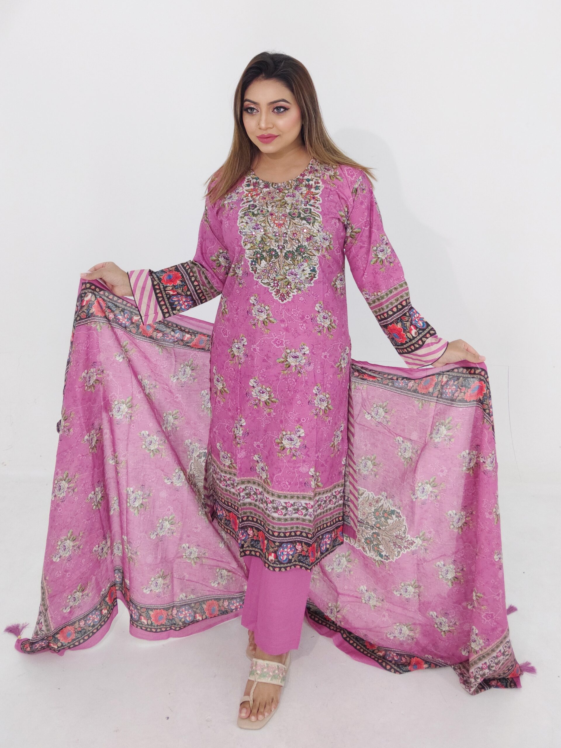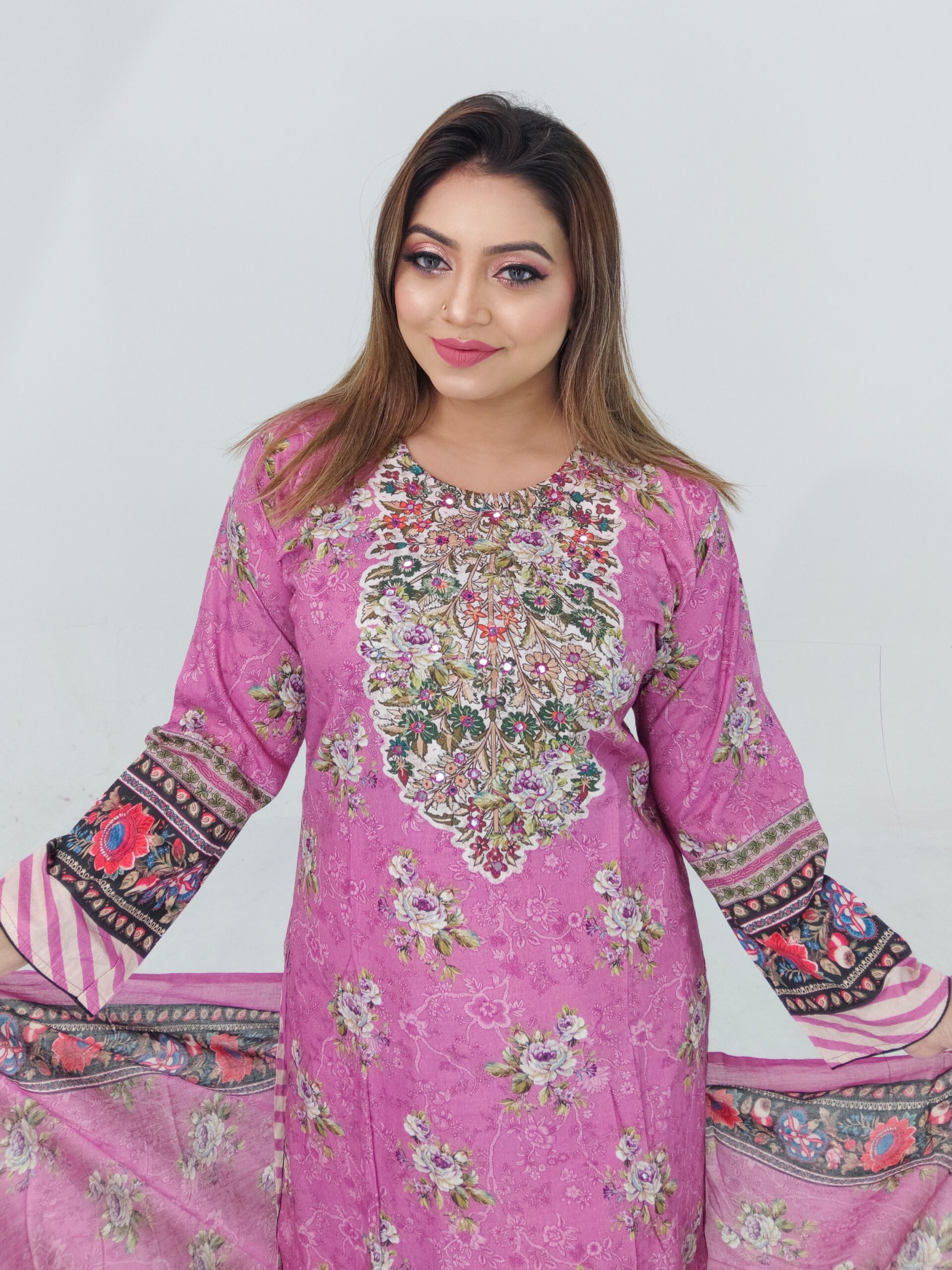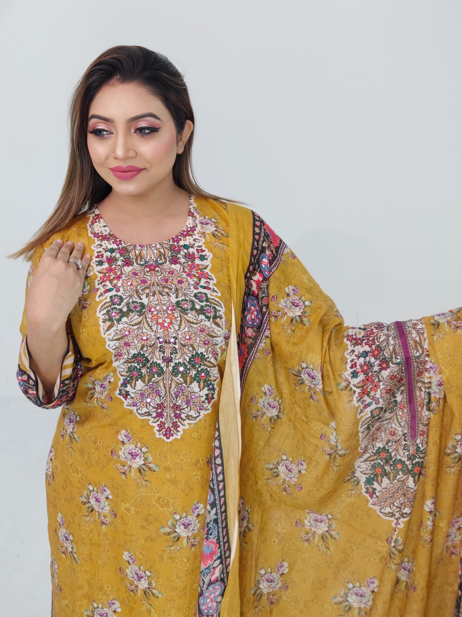 The kameez features a beautiful floral print enhanced with delicate mirror work, adding a graceful and trendy touch without making the outfit heavy. The mirror detailing gives the dress a boutique-inspired look that works well for casual occasions as well as small festive programs. The matching cotton dupatta completes the look, while the comfortable cotton pant or salwar ensures ease of movement throughout the day.