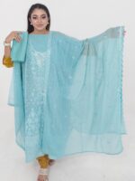 The beautiful embroidery combined with subtle sequence work adds a glamorous touch, making it perfect for party wear and festive occasions. The set includes a Butar Silk inner and Chinon Silk pant, ensuring both comfort and a premium finish.