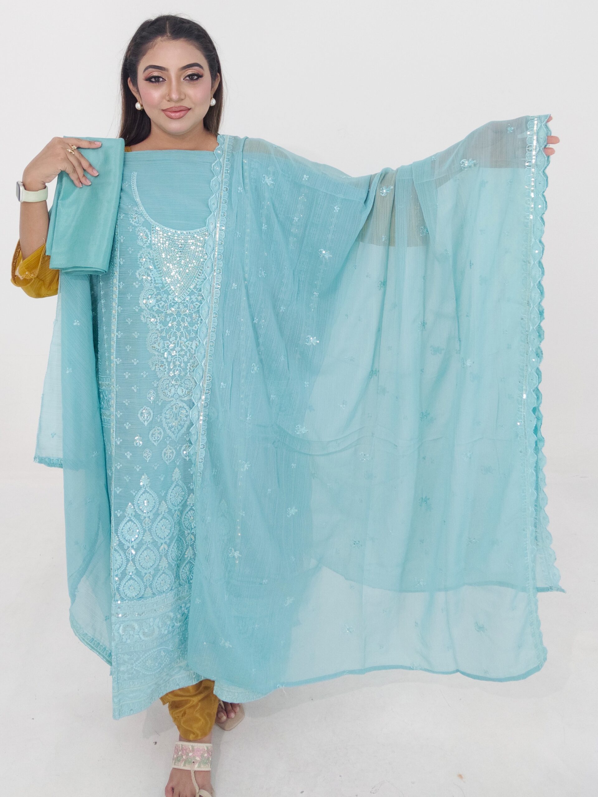 Enhance your elegance with this stunning Georgette Unstitched 4 Piece with Embroidery & Sequence Work. Designed for women who love luxury and sophistication, this outfit features premium georgette fabric for both kameez and dupatta, offering a graceful and flowy drape.