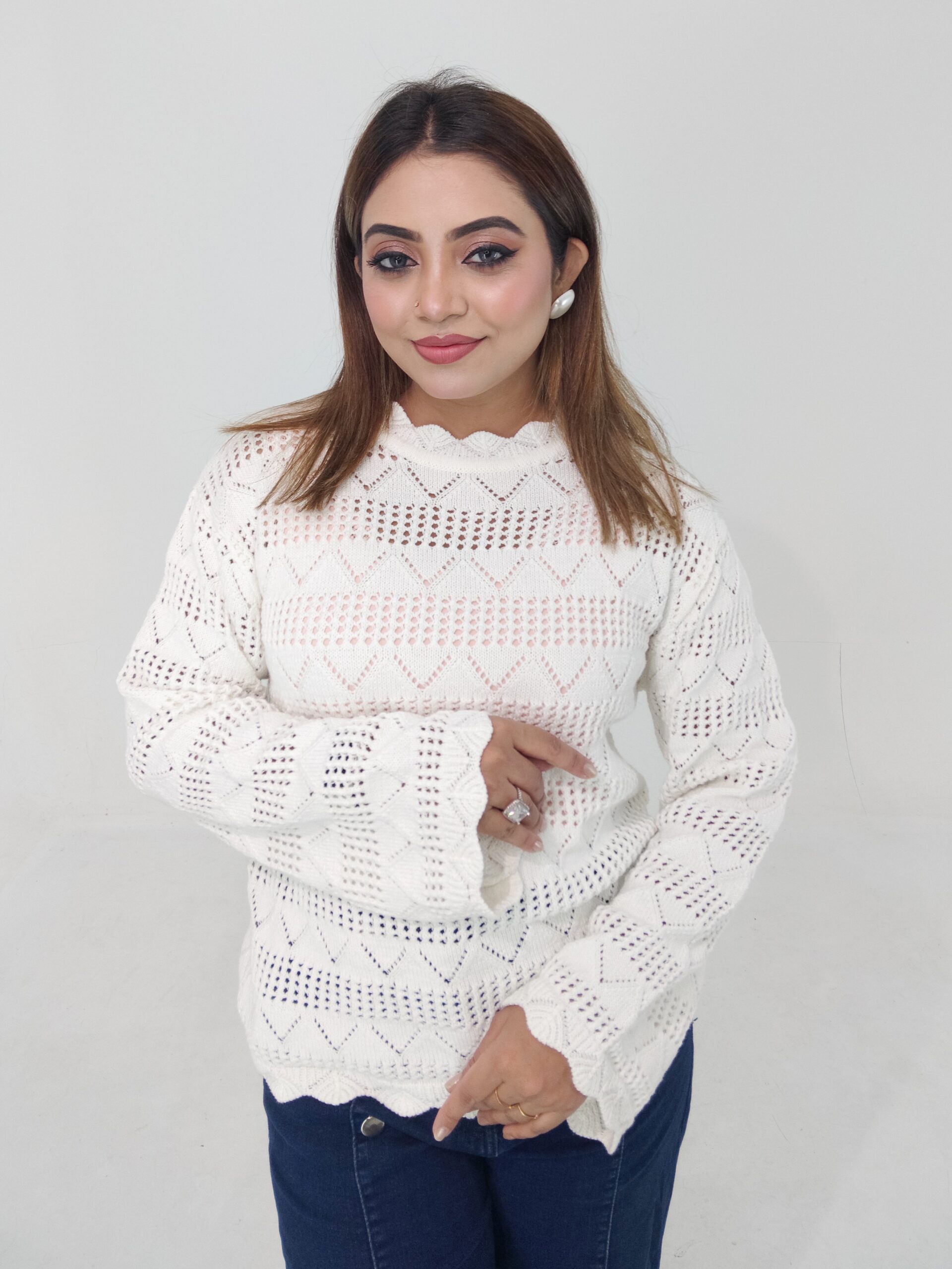 Its hollow knit texture adds a trendy and modern touch, while the bell sleeves enhance the overall elegance of the outfit. Perfect for casual outings, office wear, or daily winter styling.