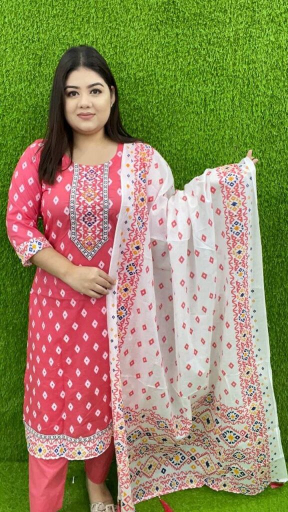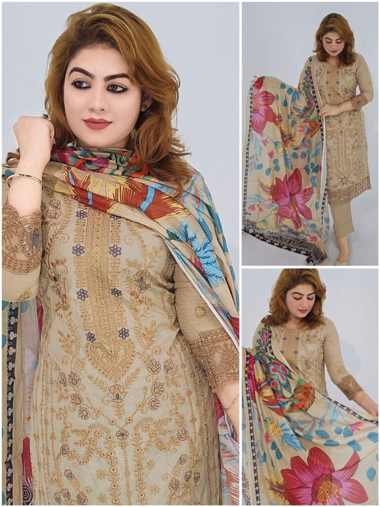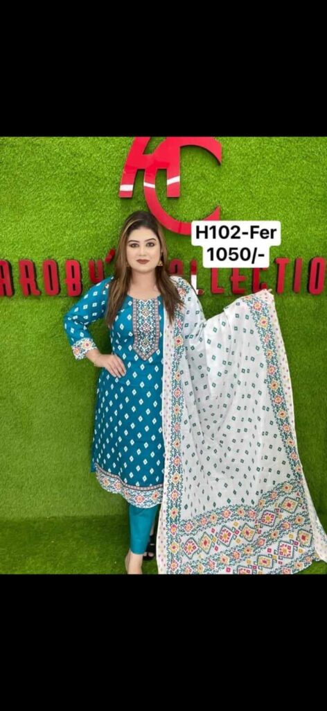 Step into timeless elegance with this Pakistani Catalogue Inspired Readymade 3 Piece Set, designed for women who love a perfect blend of comfort and style. This outfit features a beautifully printed cotton kameez, a half silk dupatta, and a comfortable straight leg cotton selwar—making it a perfect choice for daily wear, festive occasions, and family gatherings.