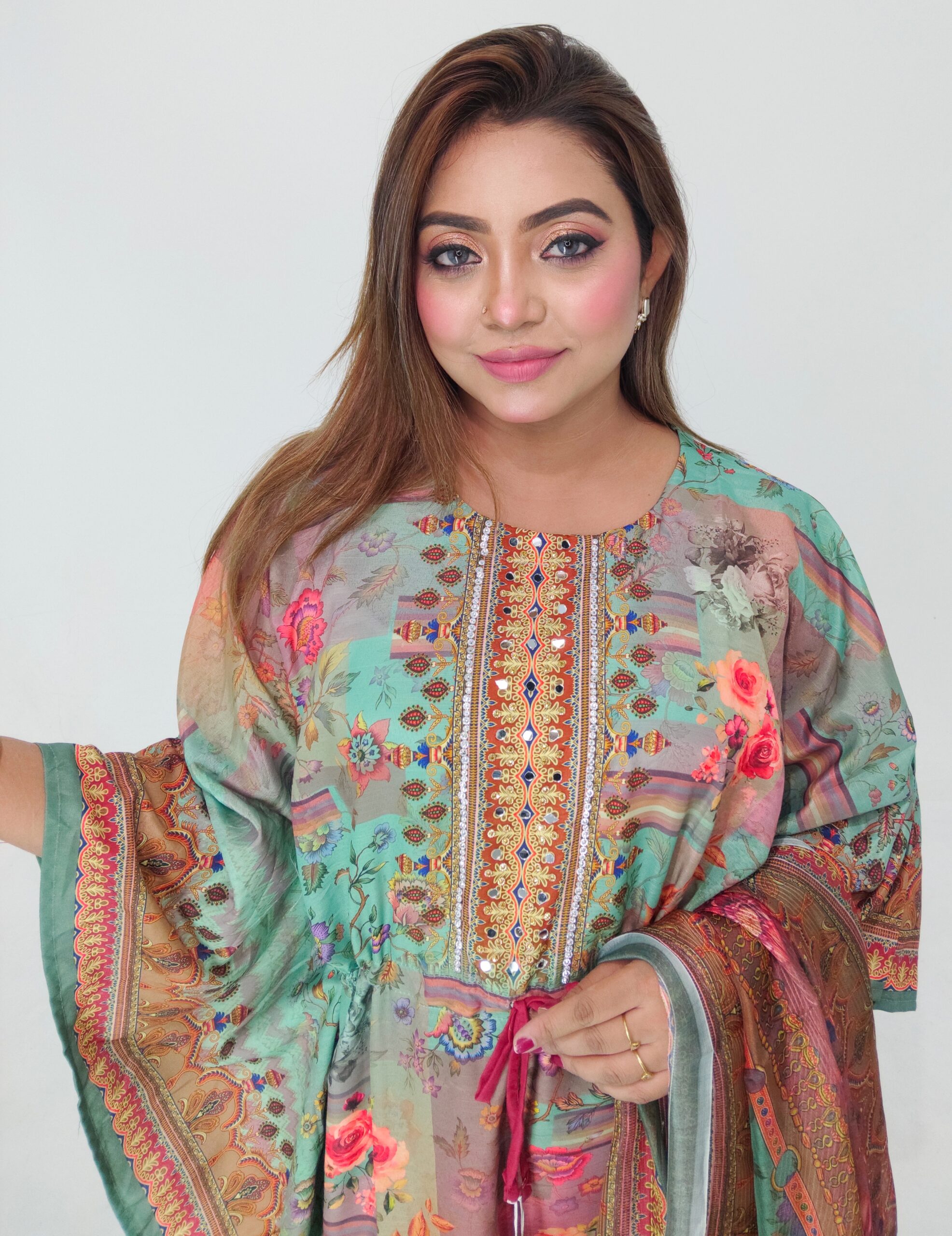This 2-piece kaftan set is available in free size, fitting up to 46 inches, ensuring an elegant fit for most body types. With a length of 45 inches, it provides full coverage and a graceful fall, perfect for women who love traditional style with a modern twist.