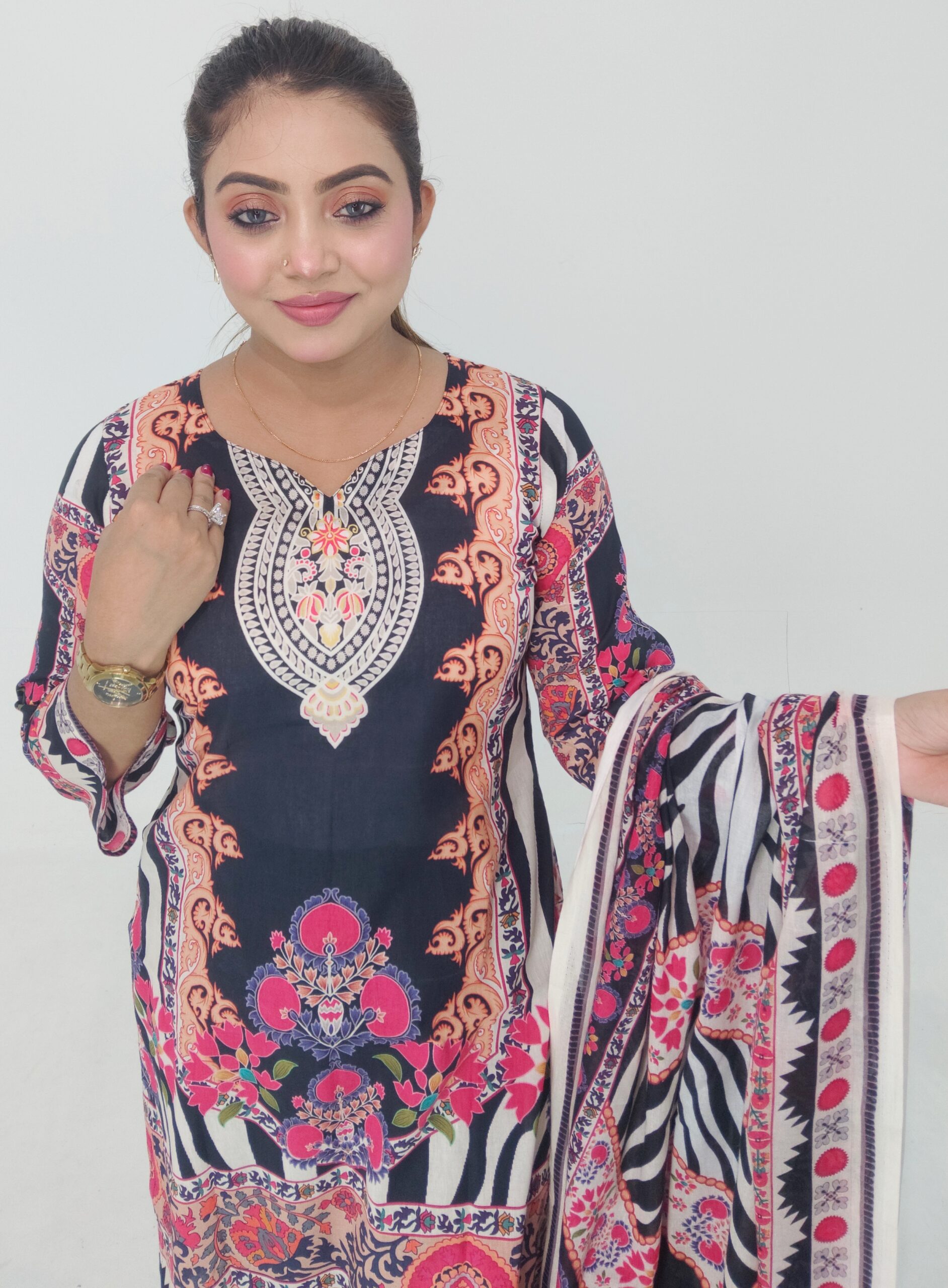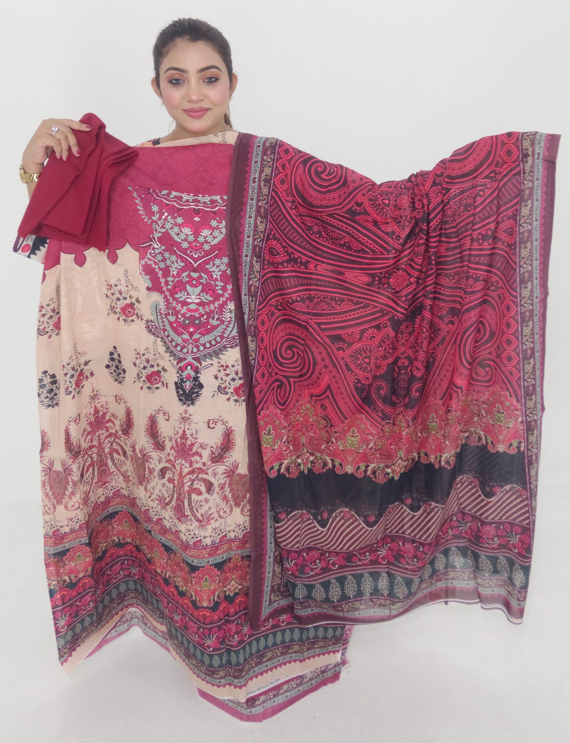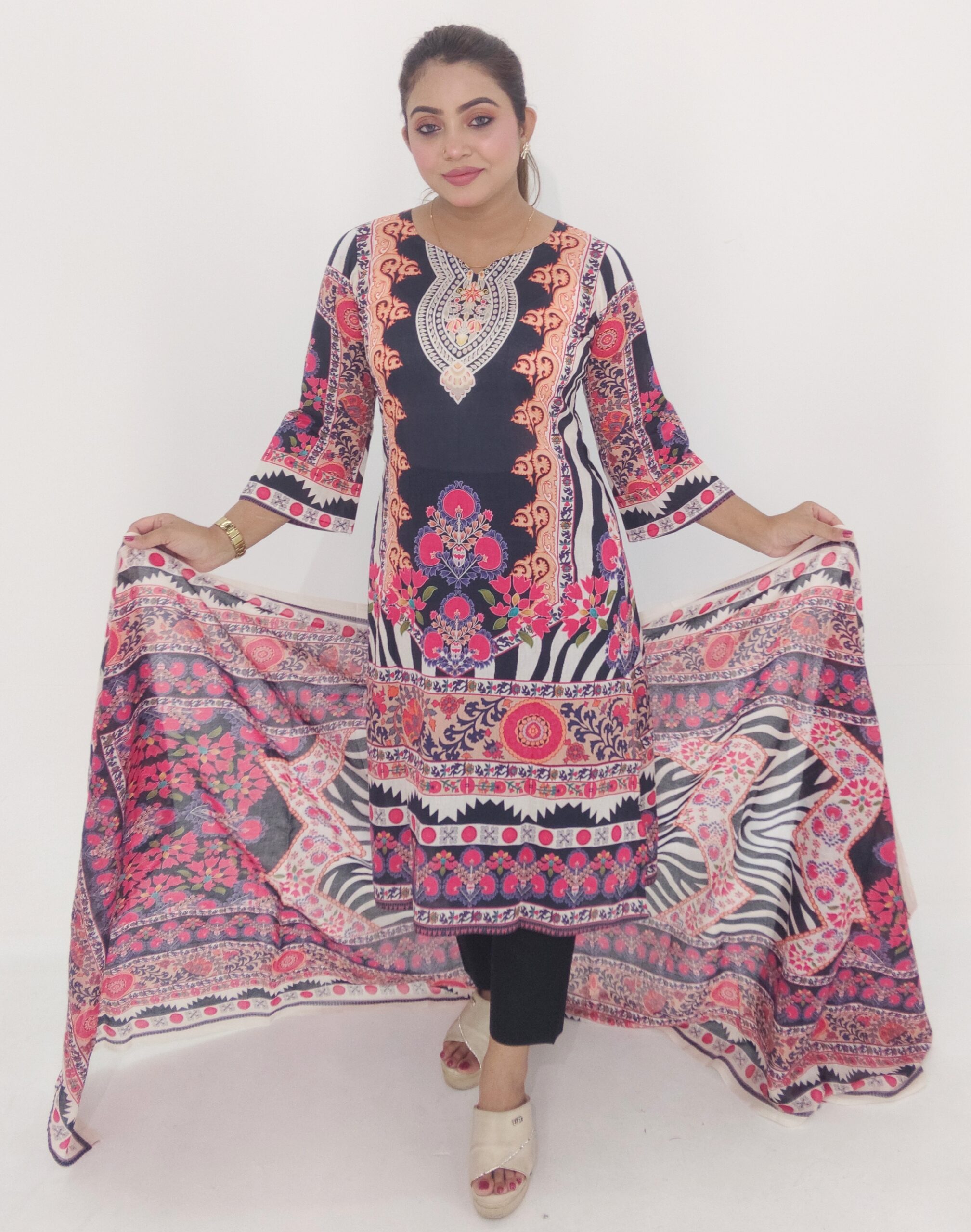 Elegant Pure Cotton Digital Print Unstitched 3 Piece, featuring premium cotton fabric and vibrant design — perfect for any season. Free delivery available across Bangladesh!