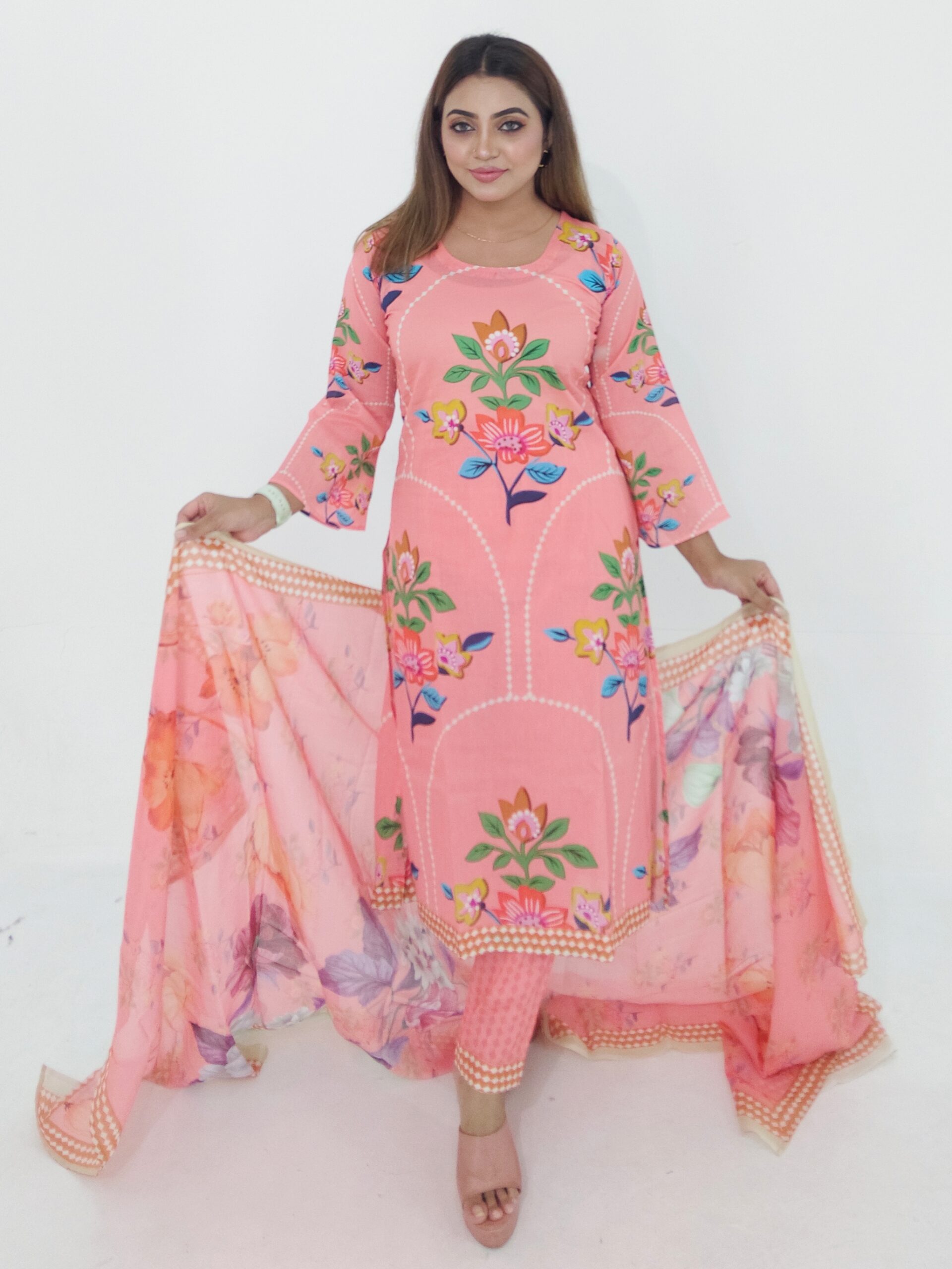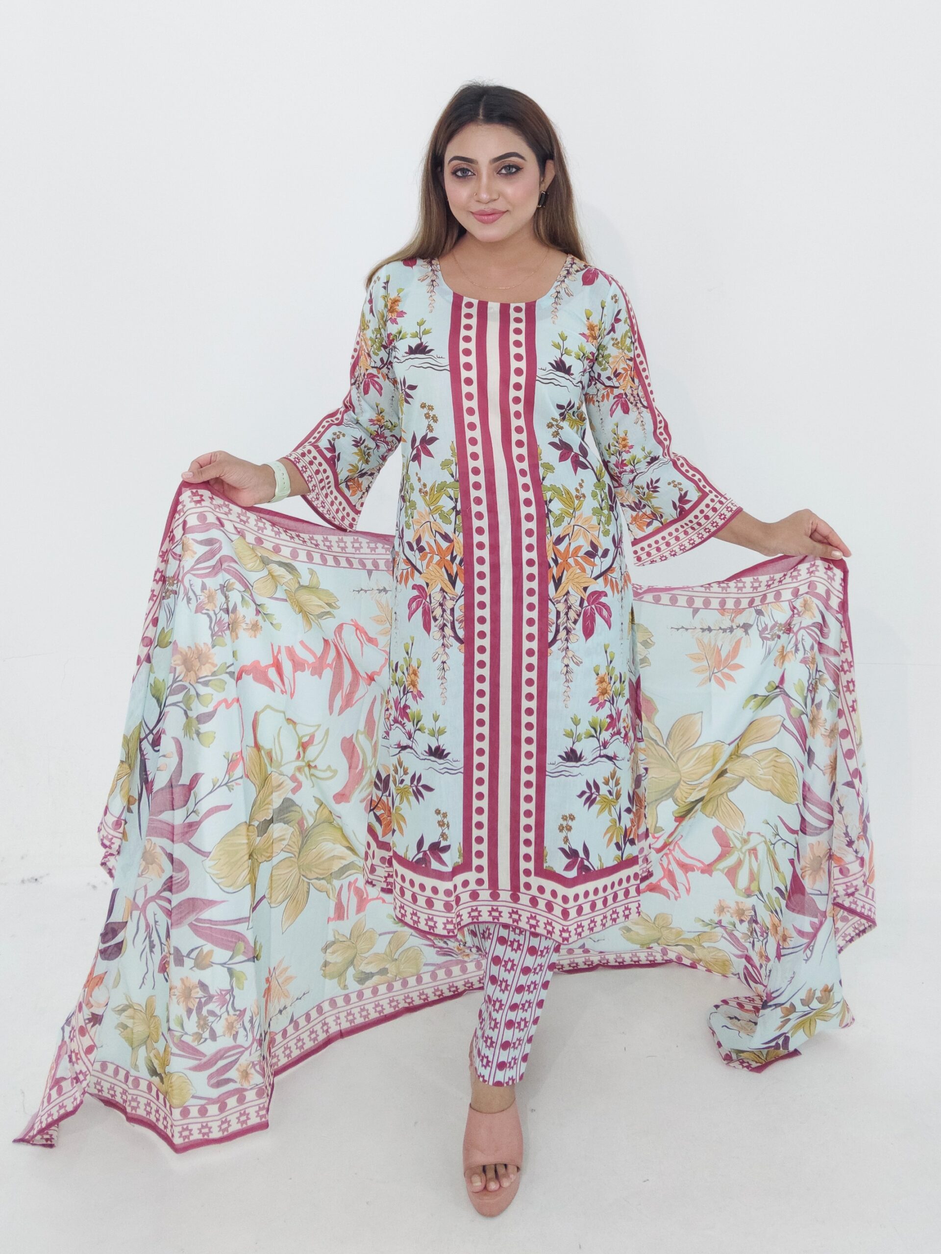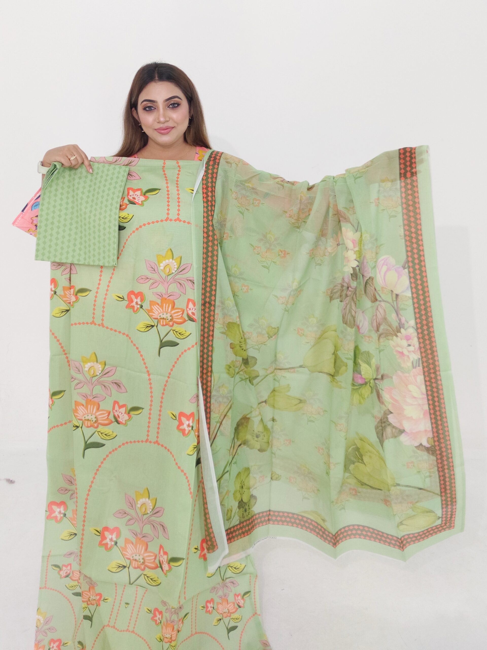The floral print kameez, matching salwar fabric, and beautifully designed dupatta make it an ideal choice for casual wear, office wear, and festive styling. You can stitch it according to your preferred style—A-line, straight-cut, or traditional kameez.