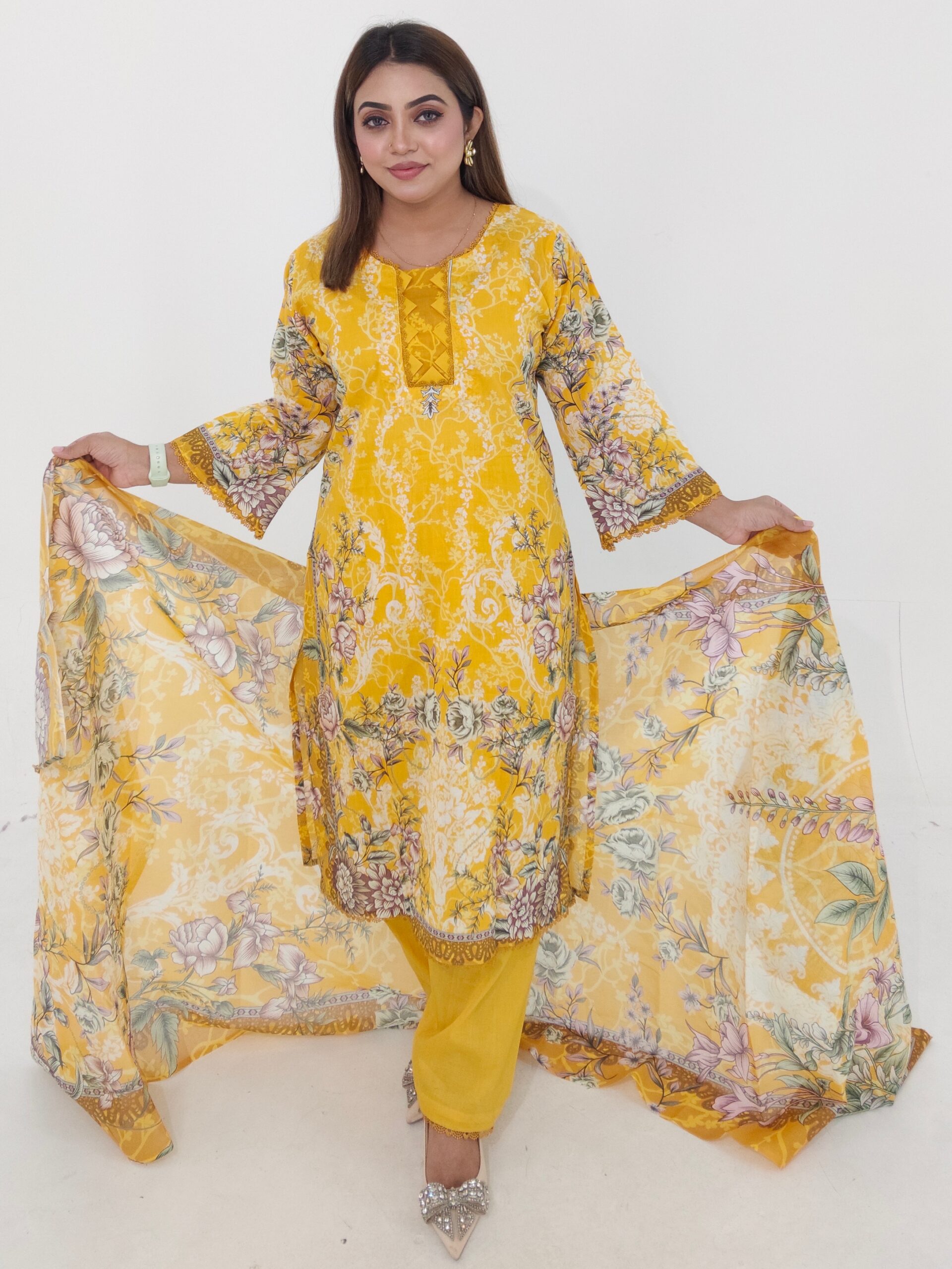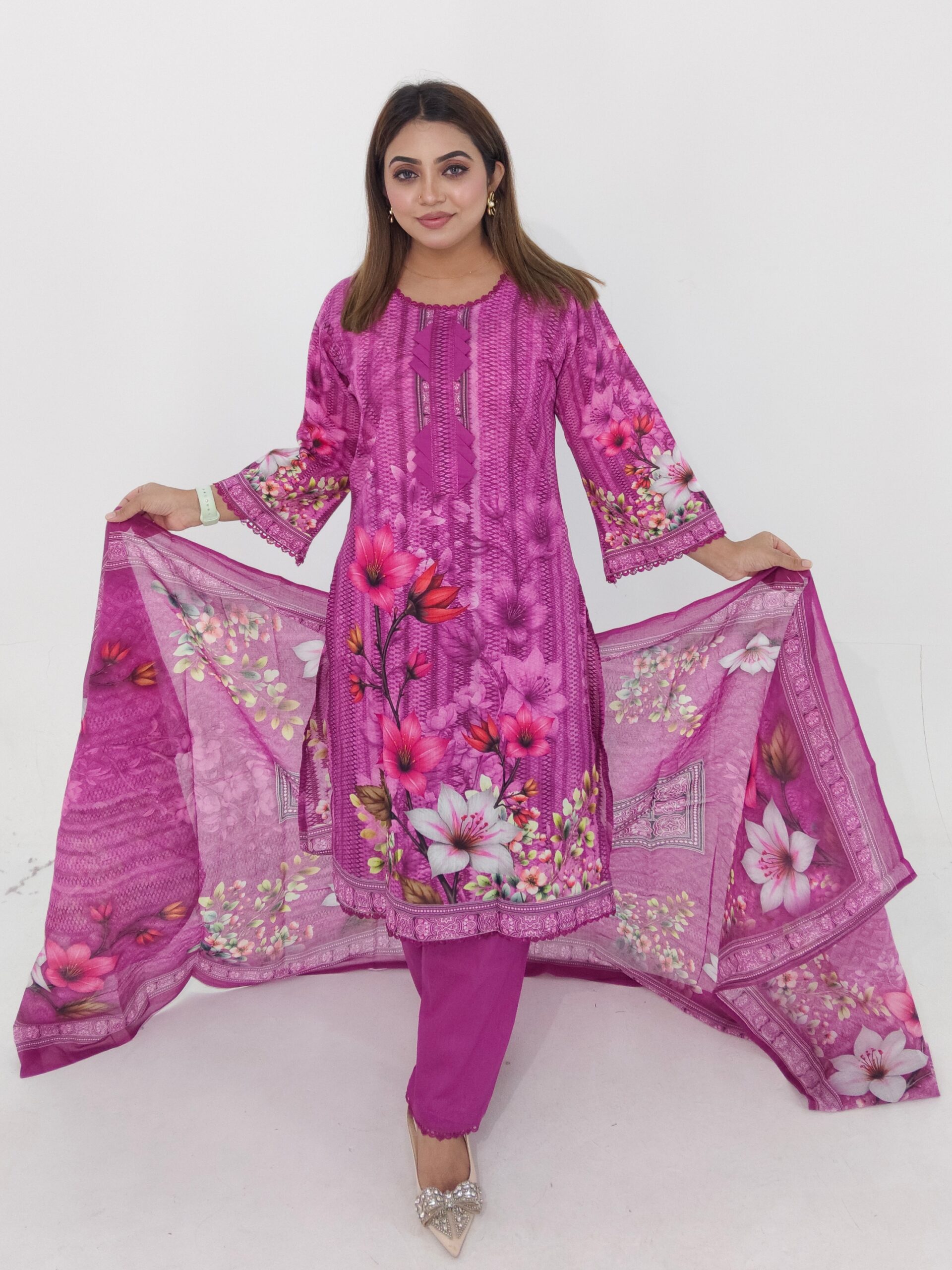 Experience timeless elegance and comfort with our Pure Cotton Floral Print Lace Work Readymade 3 Piece. Crafted from premium pure cotton, this outfit ensures a soft and breathable feel — perfect for everyday wear or special occasions.