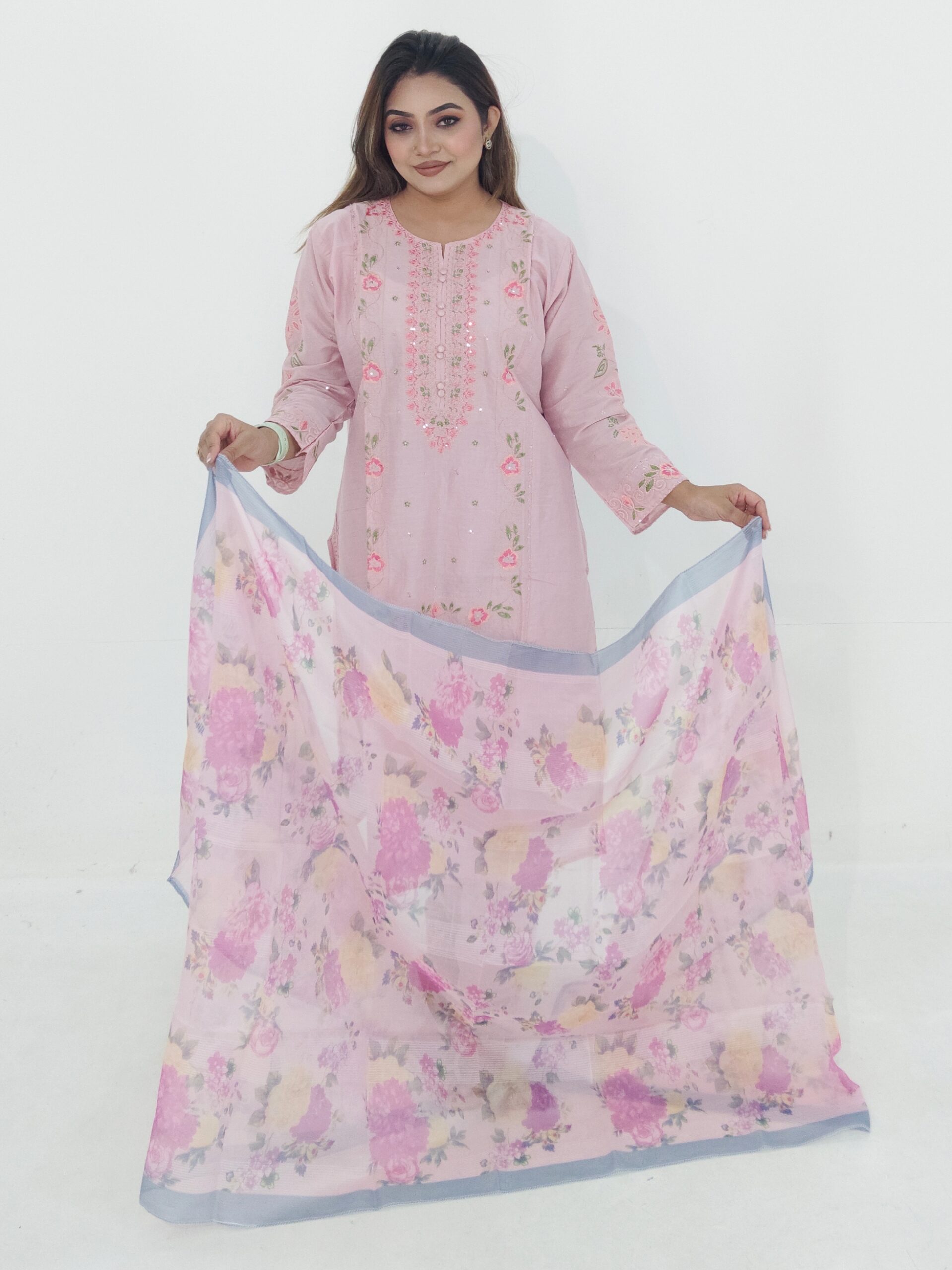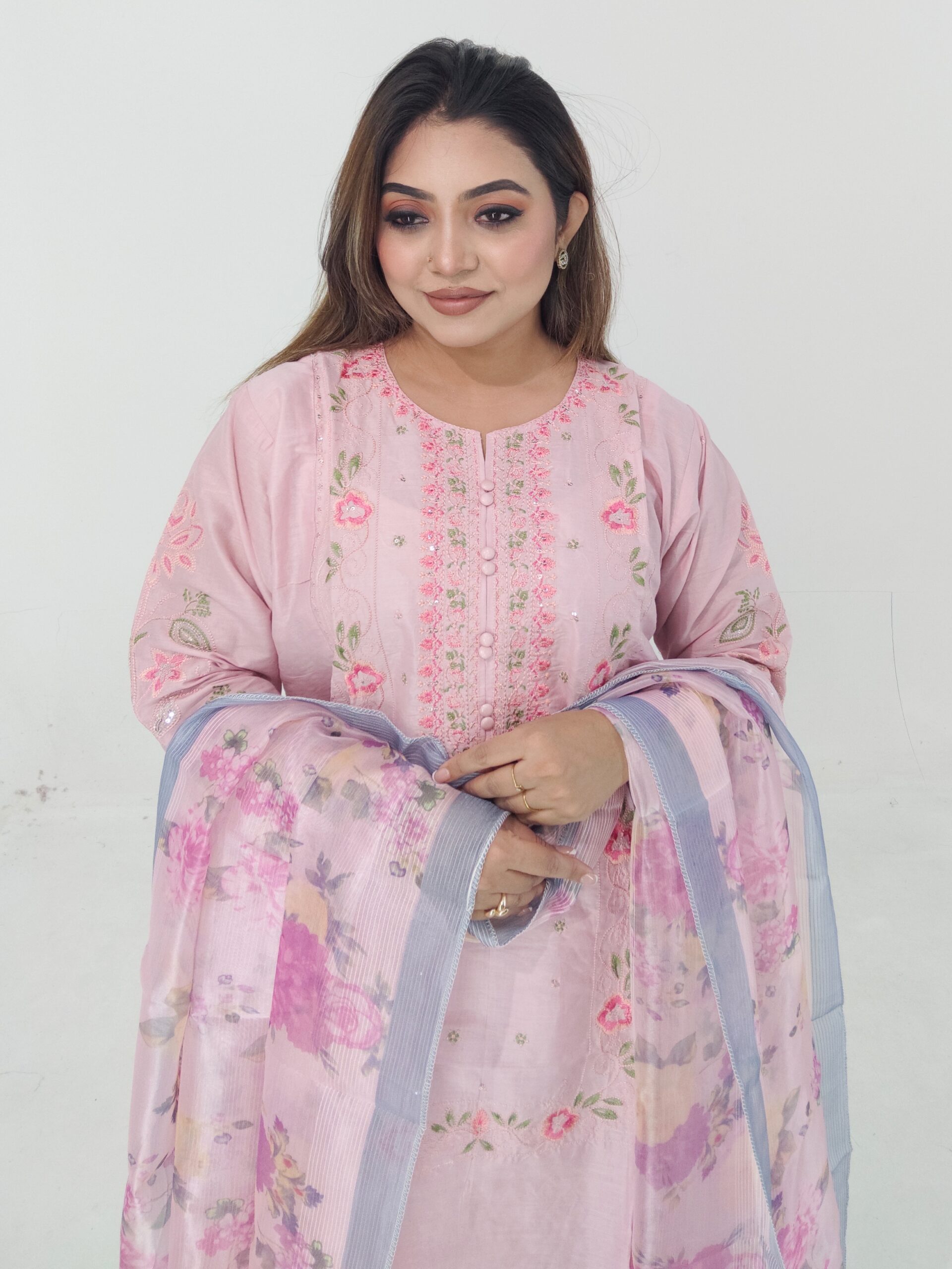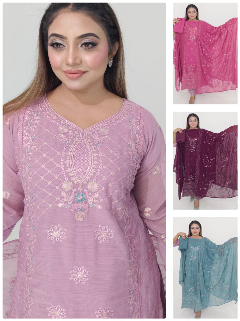 Upgrade your everyday wardrobe with this beautiful Cotton Readymade 3 Piece from Aroby’s Collection. Designed with a stylish coat button panel and delicate embroidery work, this outfit combines elegance with comfort.