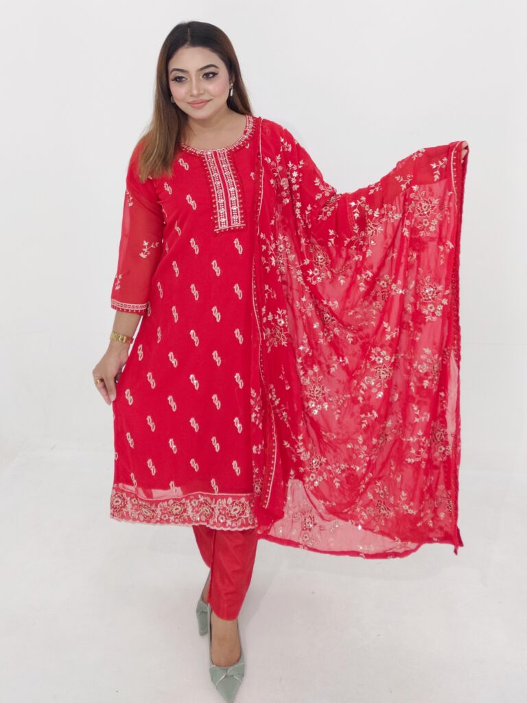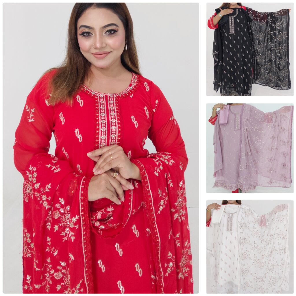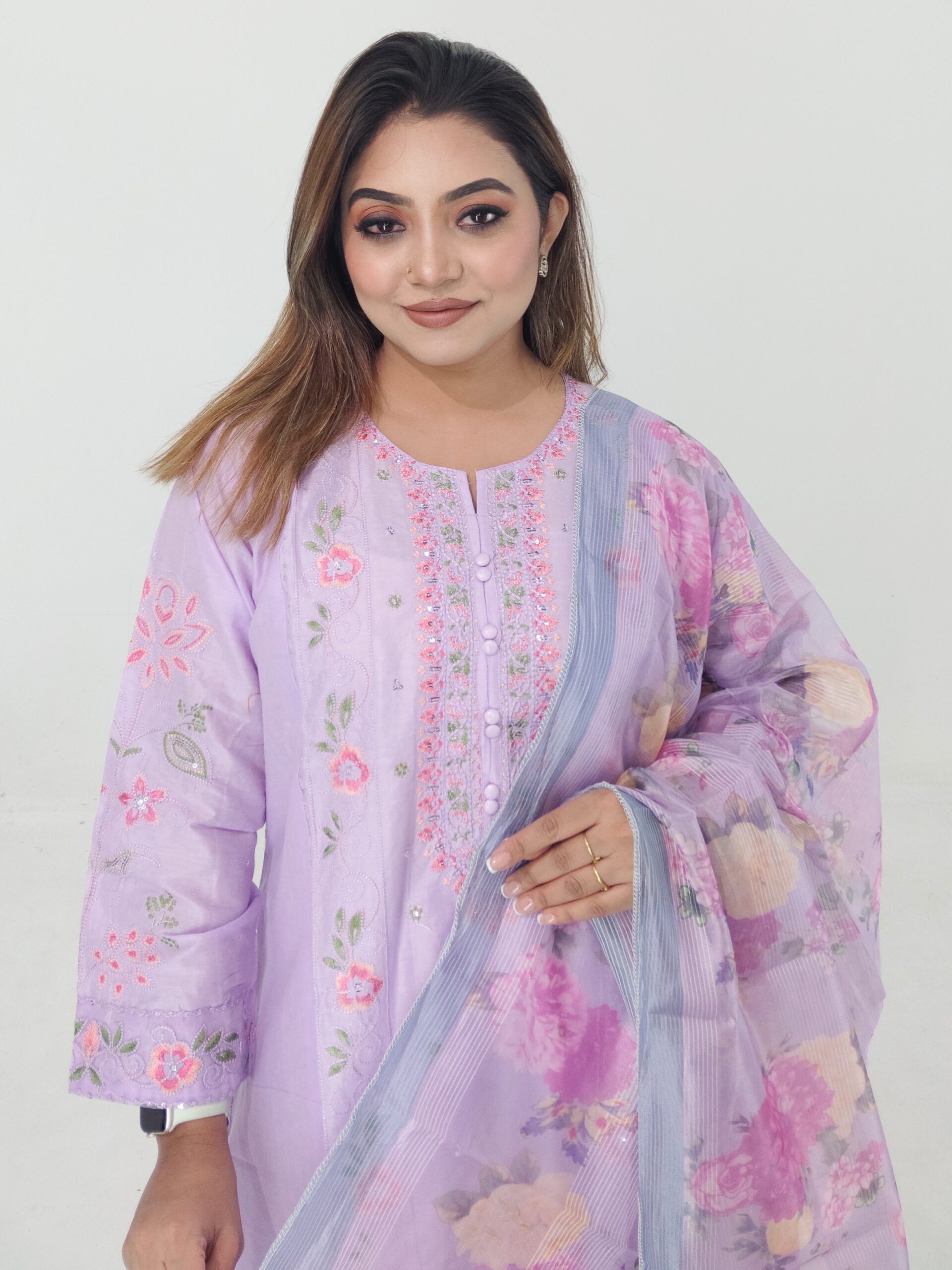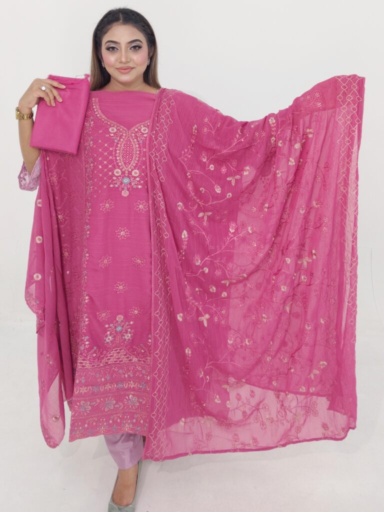 Upgrade your everyday wardrobe with this beautiful Cotton Readymade 3 Piece from Aroby’s Collection. Designed with a stylish coat button panel and delicate embroidery work, this outfit combines elegance with comfort.