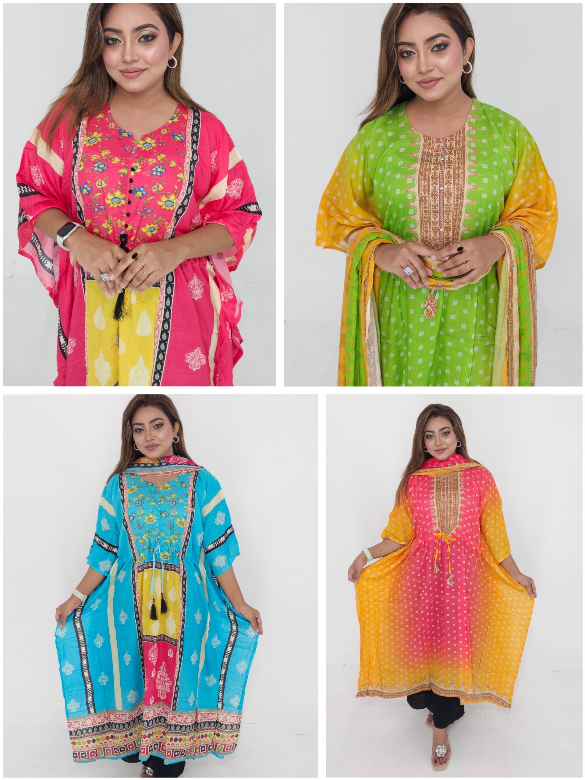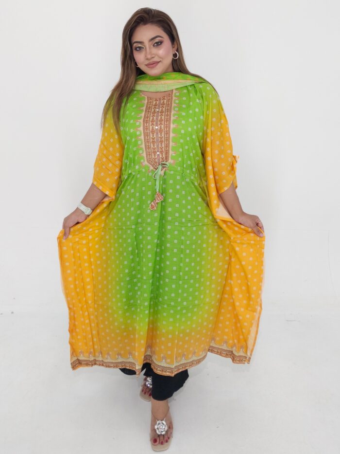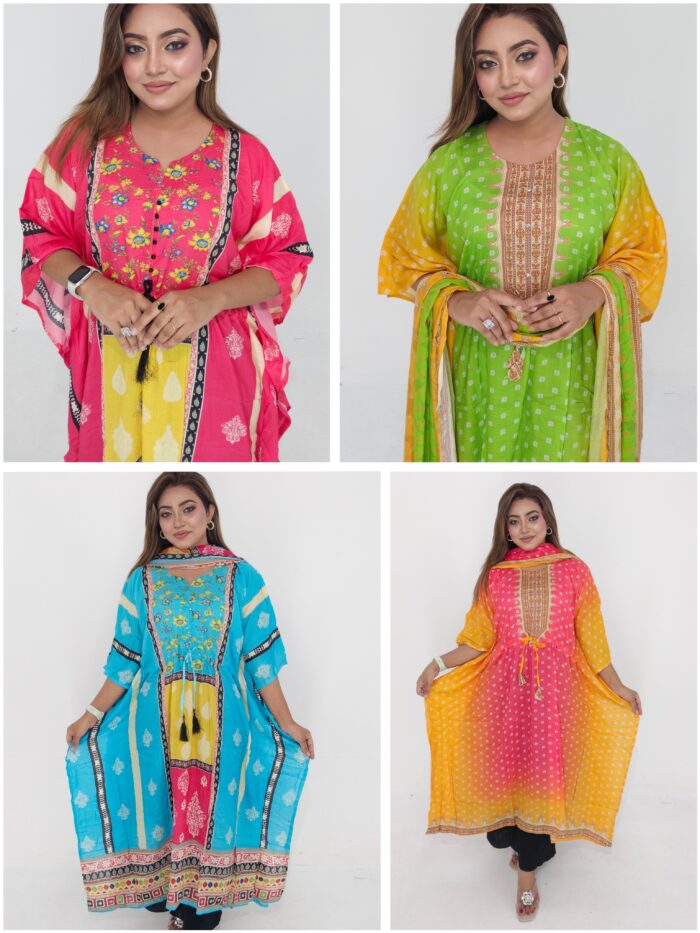 This outfit includes a beautifully crafted kaftan and matching dupatta, made from soft, breathable cotton fabric. The kaftan features a free size body (up to 46″) and a length of 45 inches, ensuring a perfect and relaxed fit for different body shapes. The lightweight material makes it ideal for everyday wear, while the elegant design gives it a boutique-style finish suitable for outings, home wear, and small occasions.
