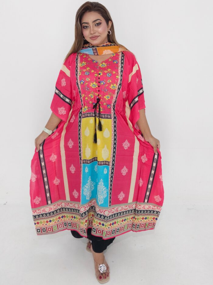 Trendy readymade cotton kaftan 2 piece set with matching dupatta. Perfect for daily wear and casual outings. Comfortable free size design with elegant printed style.