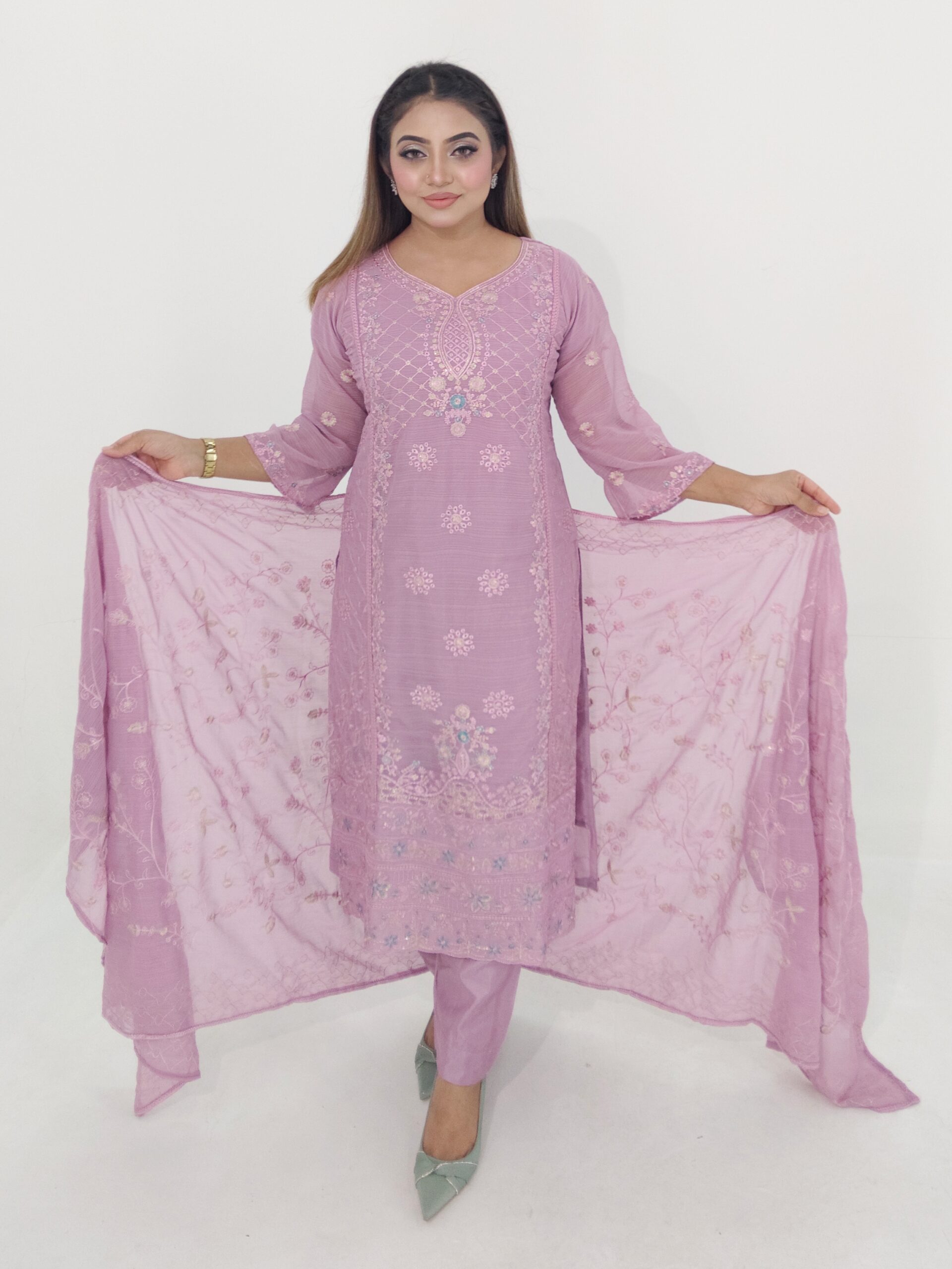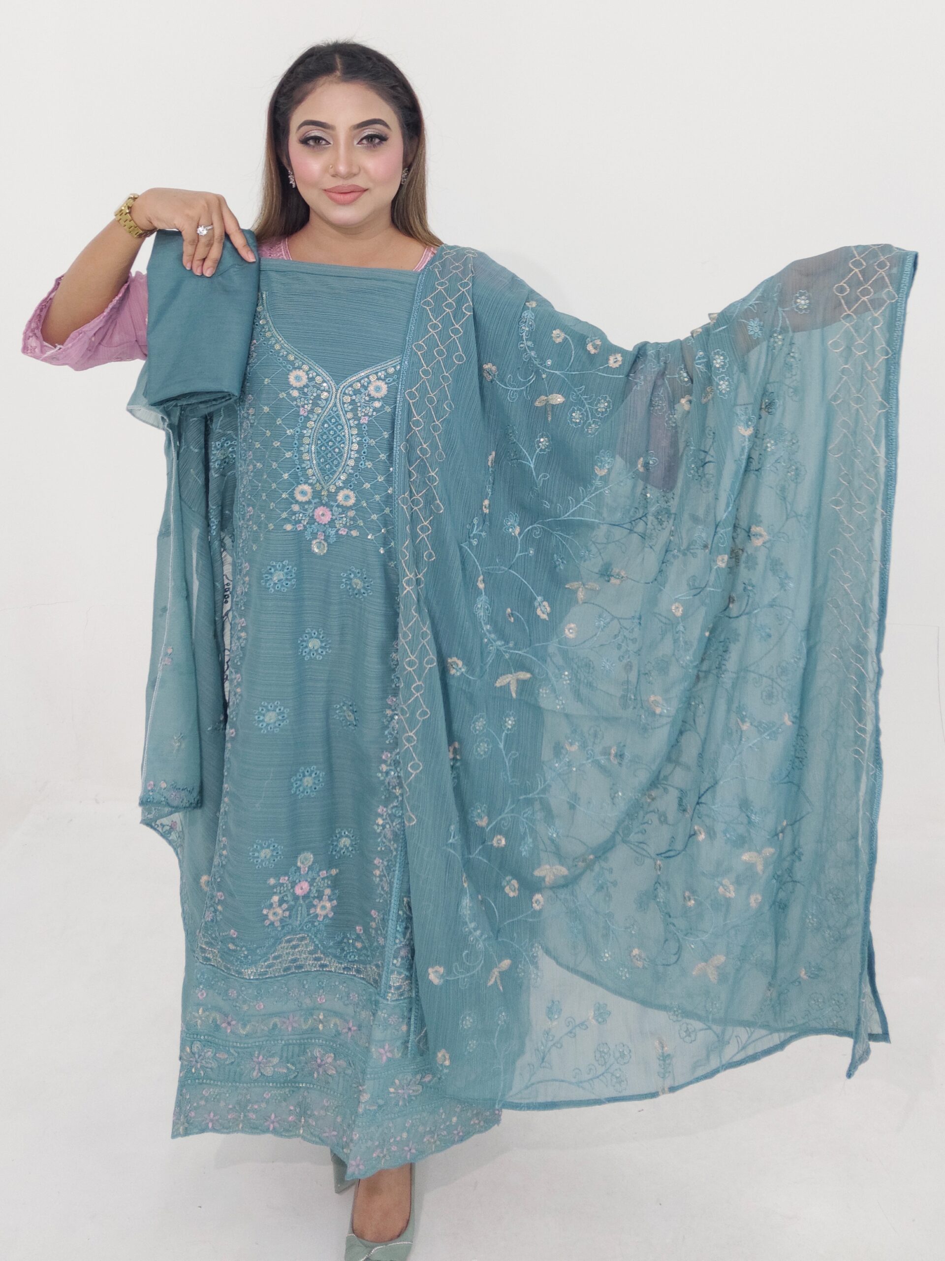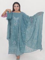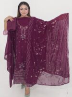 The chinon silk inner and salwar provide a smooth and comfortable base, while the georgette dupatta with matching embroidery and sequence work completes the outfit with grace. This unstitched set allows full customization, letting you tailor the outfit according to your preferred design and fitting.