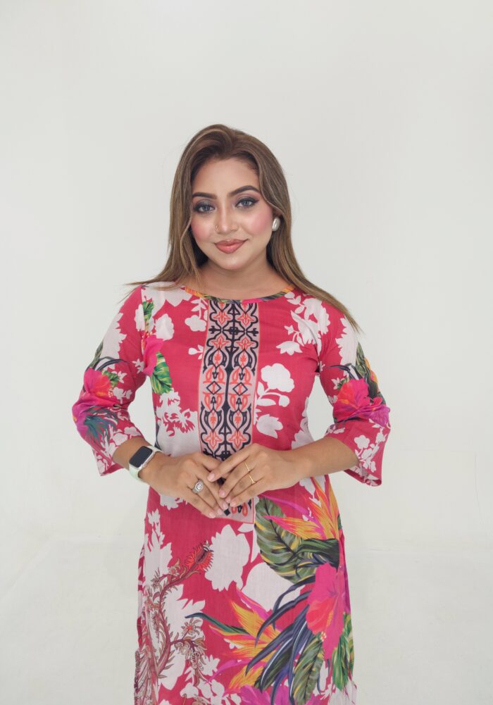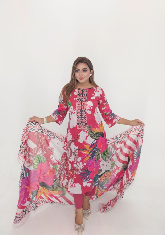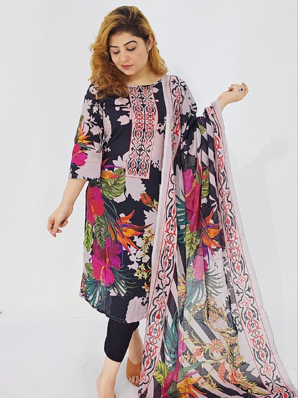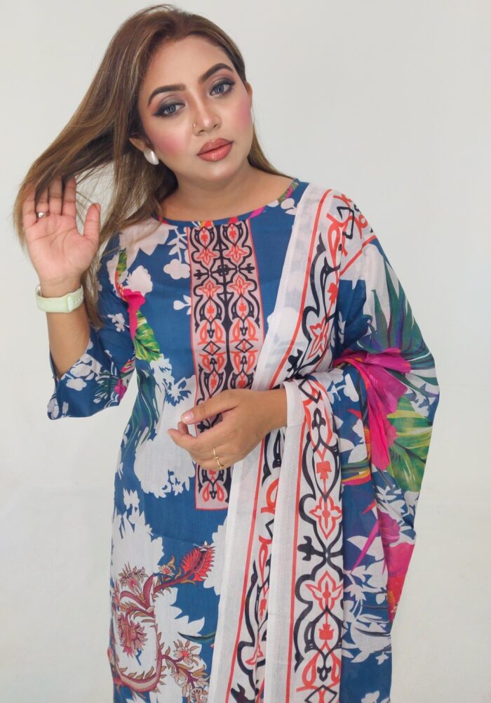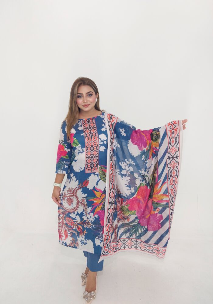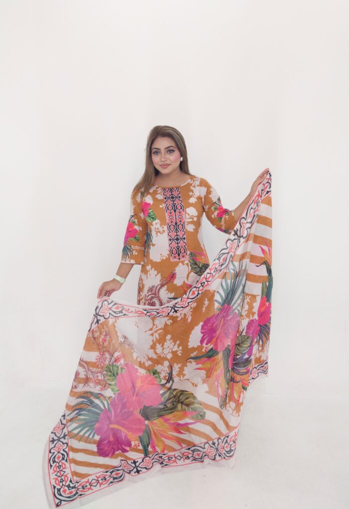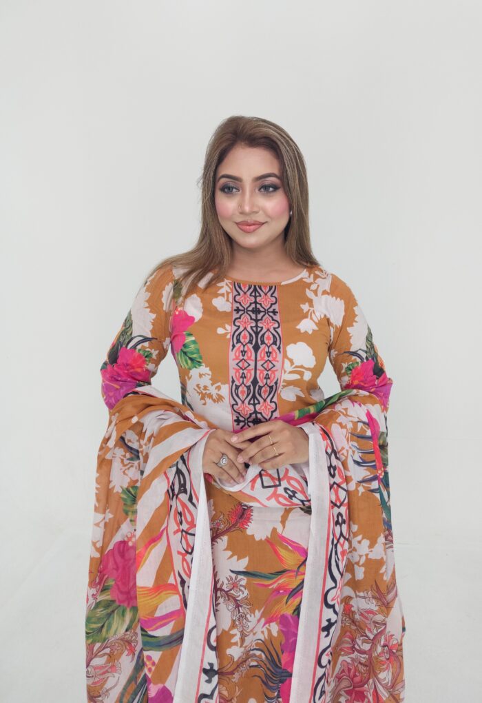 High-quality unstitched cotton lawn in vibrant digital print — includes 47″ kamiz and 76″ of body fabric—perfect for custom stitching. Stylish, breathable & affordable at just ৳1199