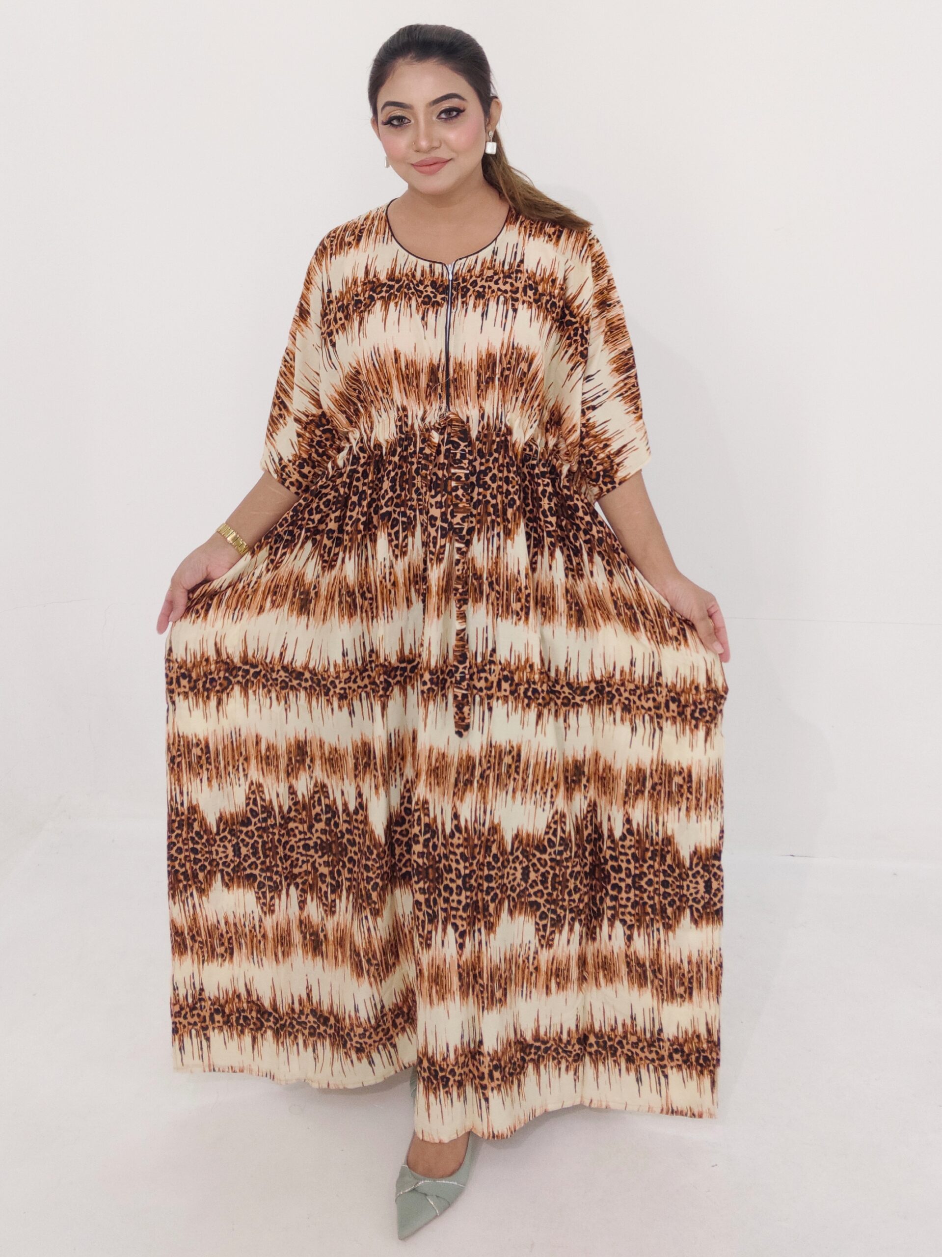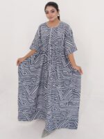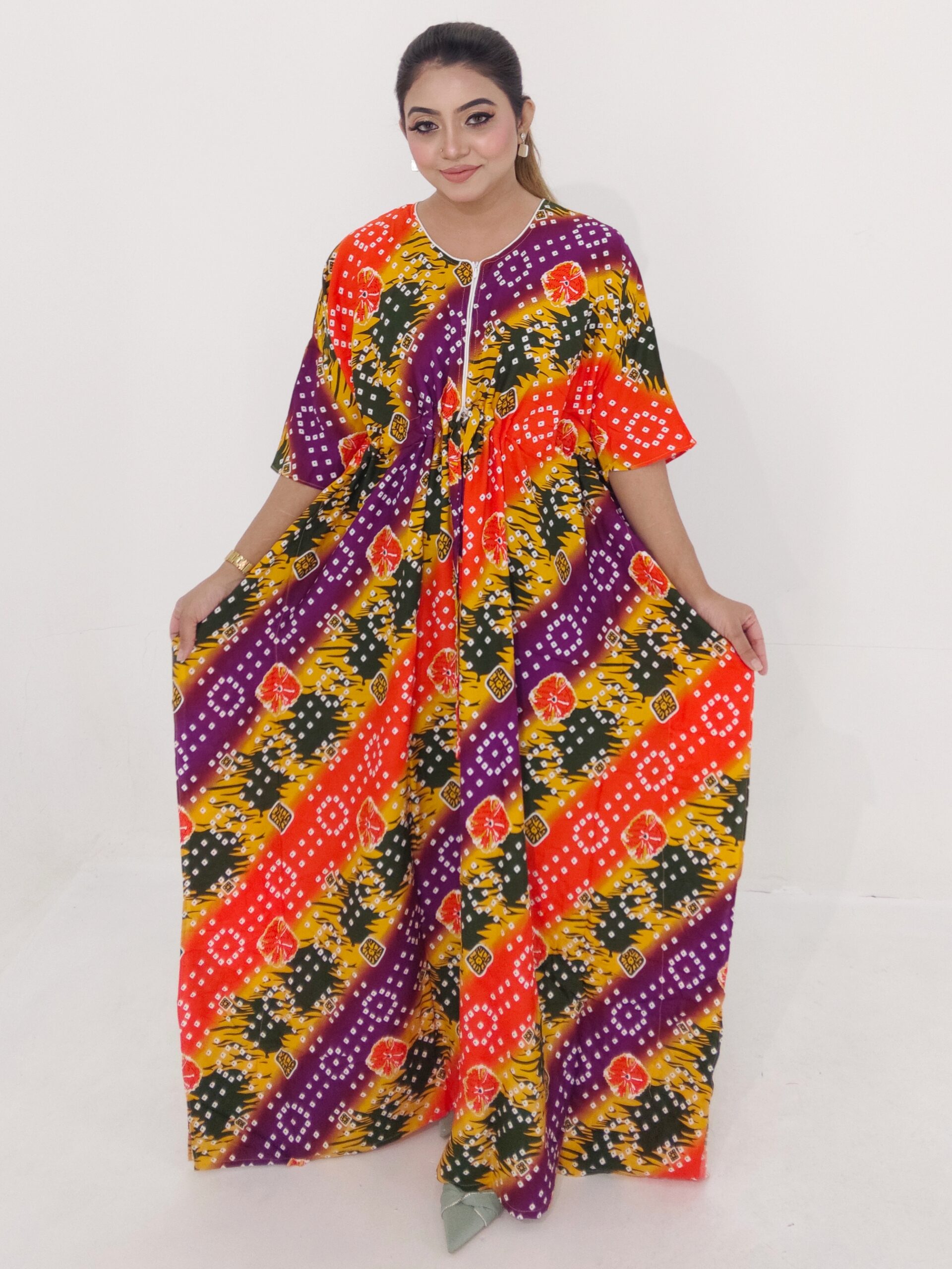 The front zipper style adds convenience and a modern touch, while the digital print design enhances the overall elegance of the outfit. Designed in a free-size fit (up to 54 inches), this maxi dress provides a relaxed and flattering silhouette for different body types. The 54-inch length offers graceful coverage and a stylish flow.