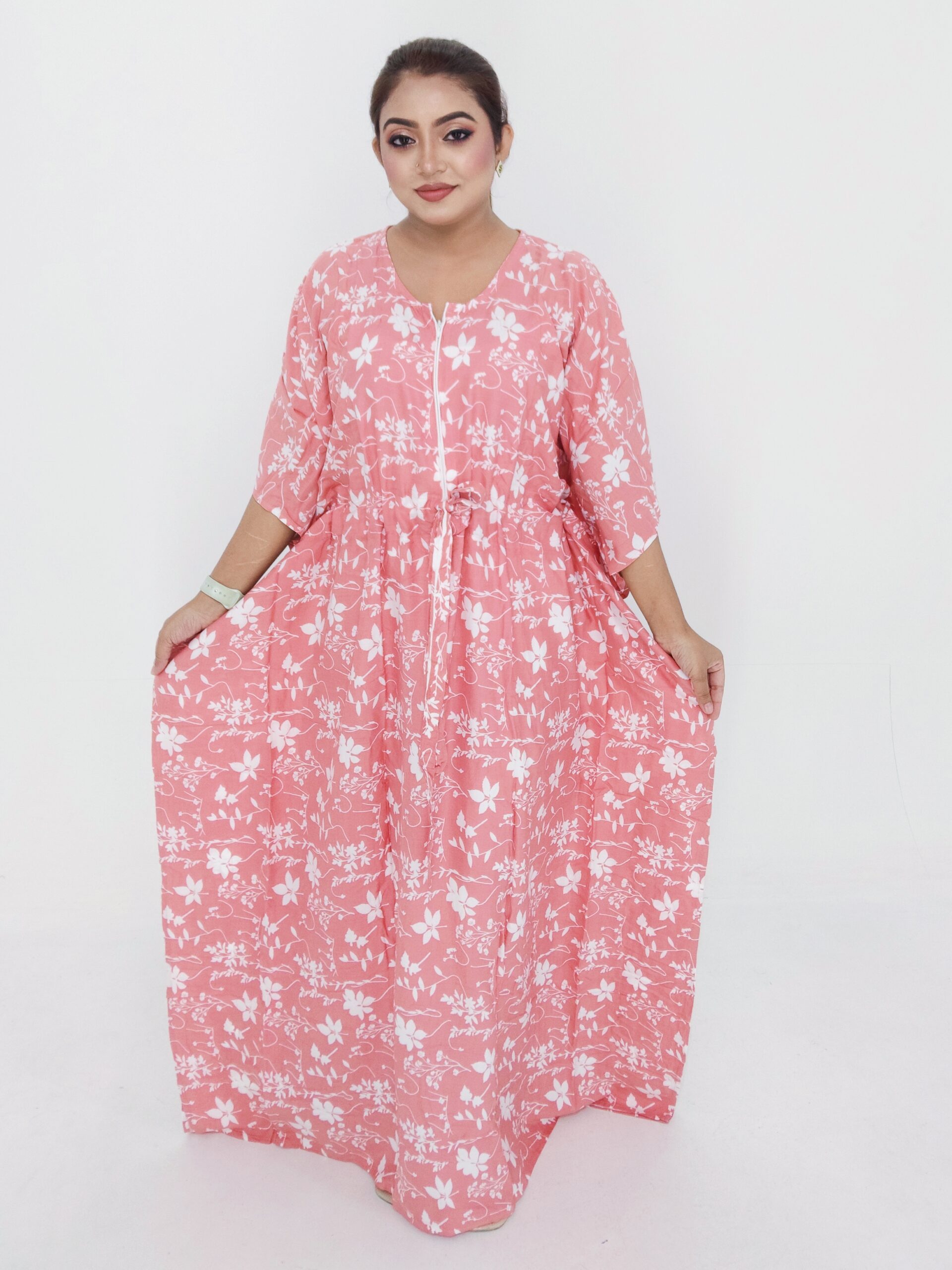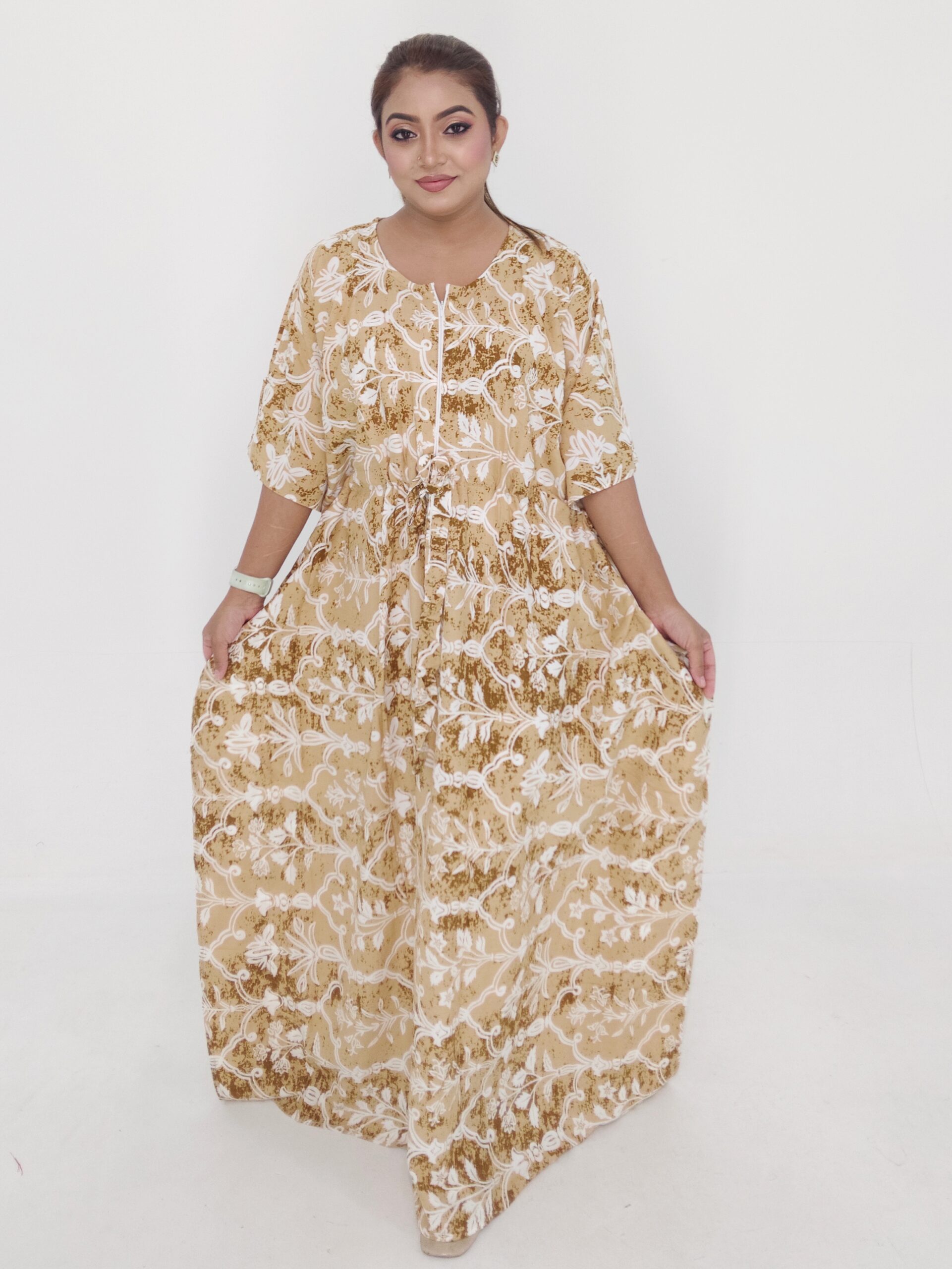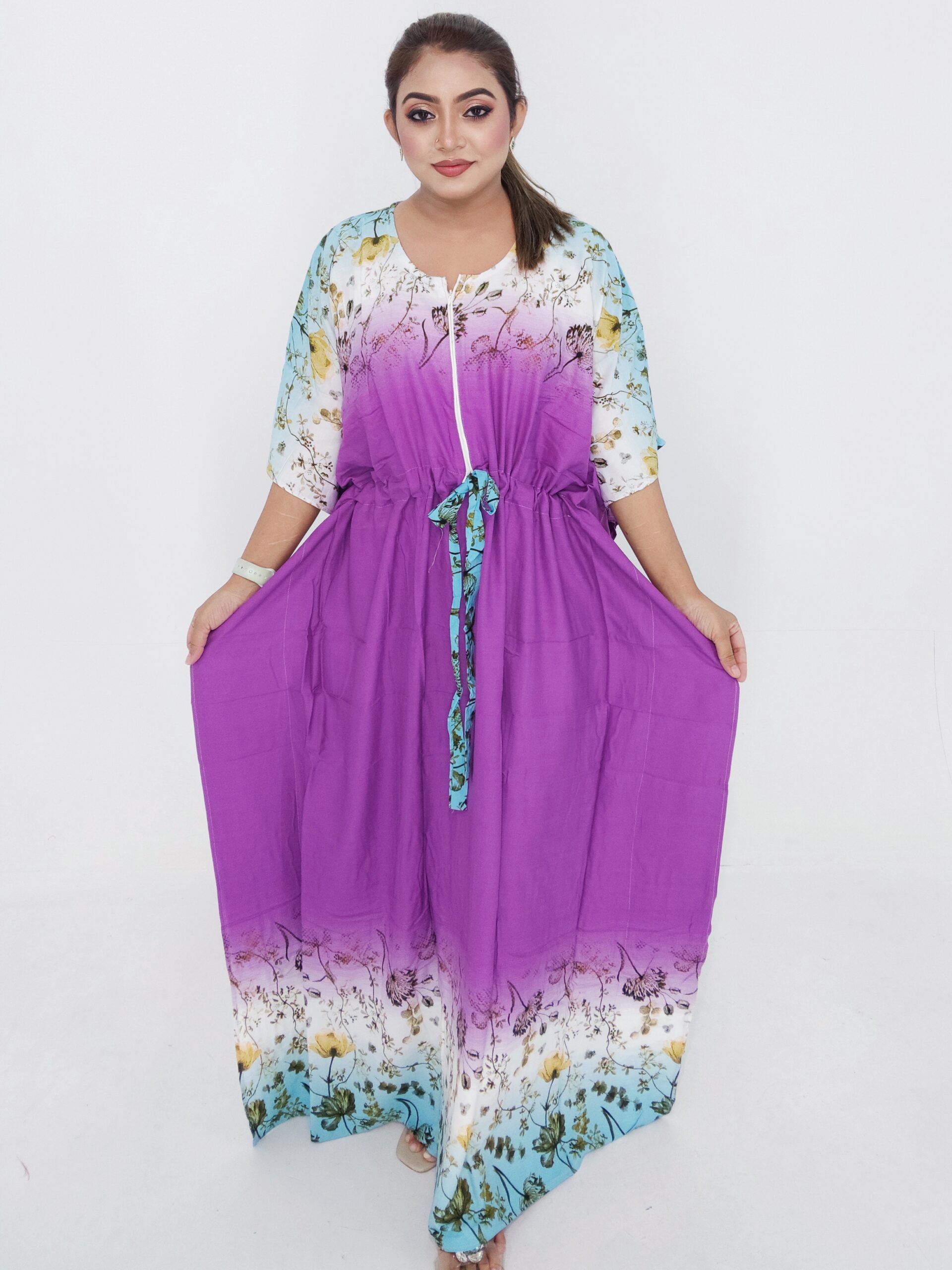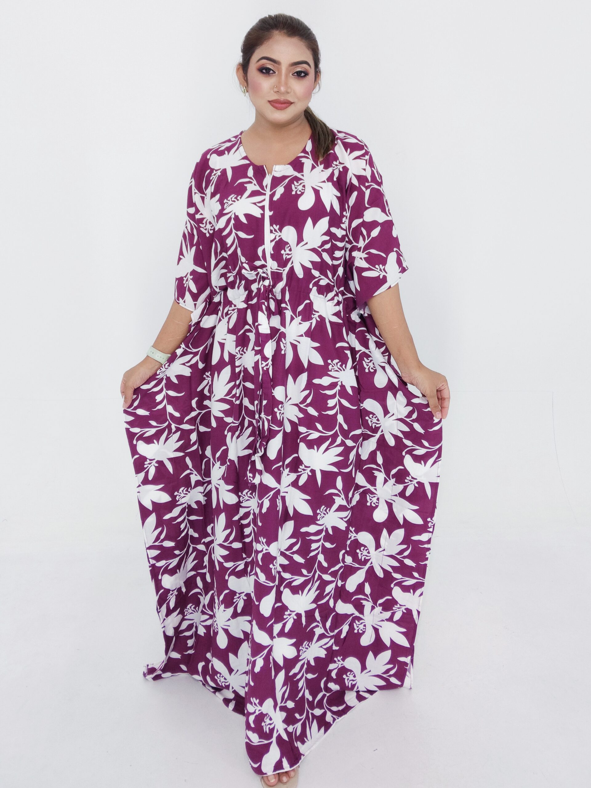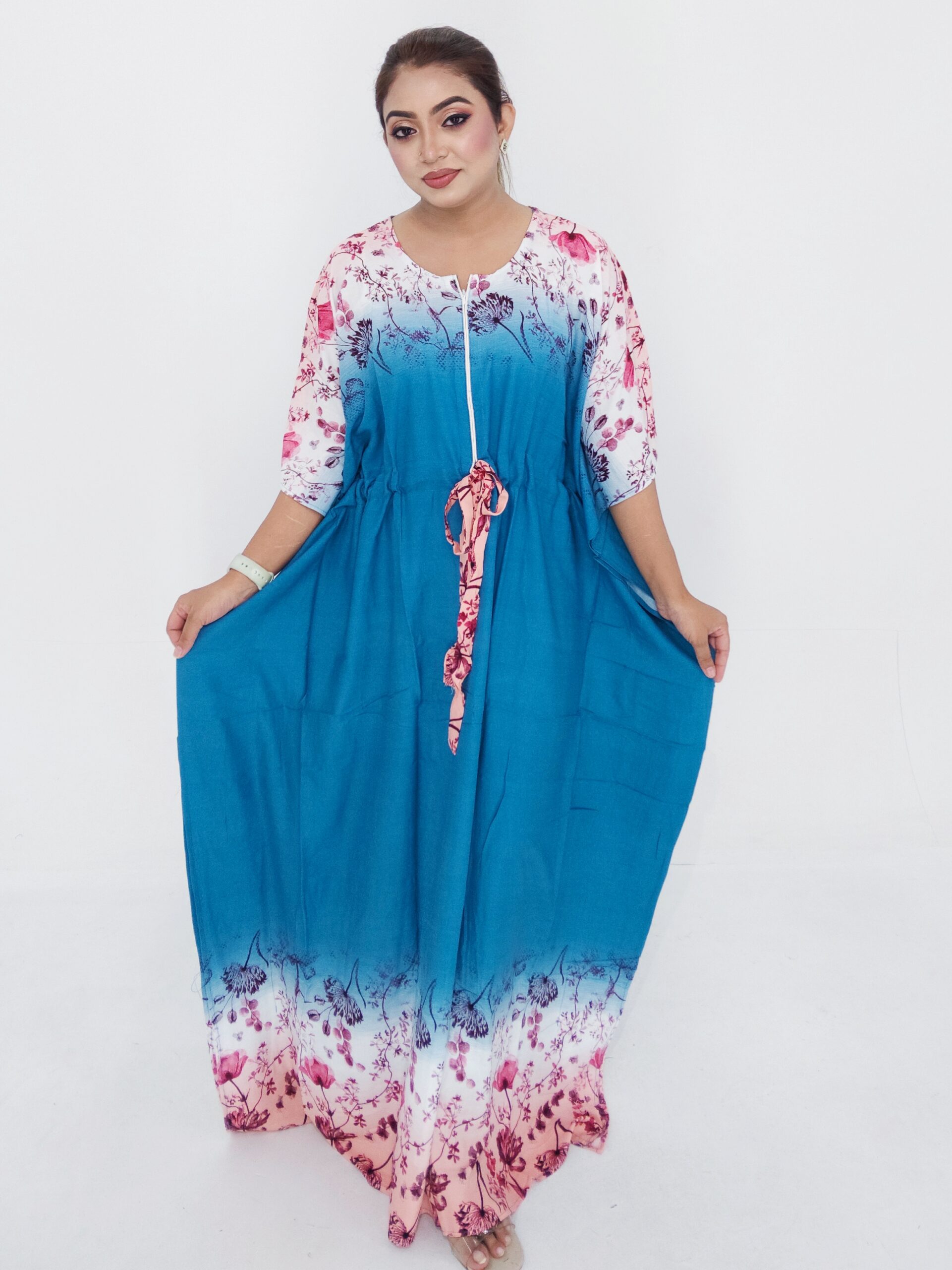 Designed with a front zipper style, this kaftan maxi offers both modern elegance and functional ease. The free-flowing design ensures a graceful look while allowing maximum comfort. With a free size fit up to 58 inches body and length of 55 inches, this dress is suitable for different body shapes, providing confidence and comfort at the same time.